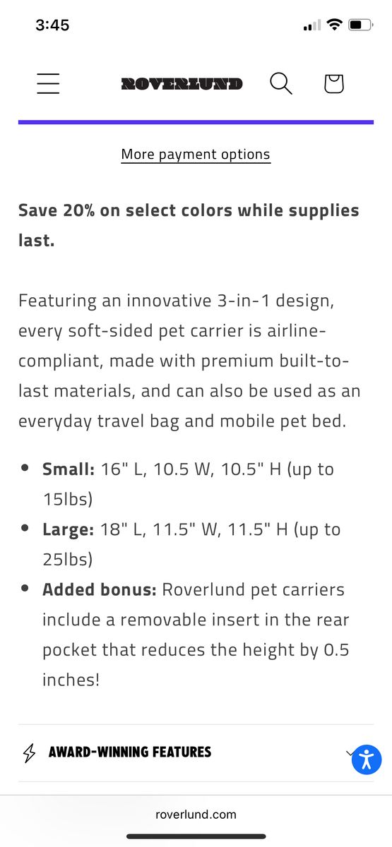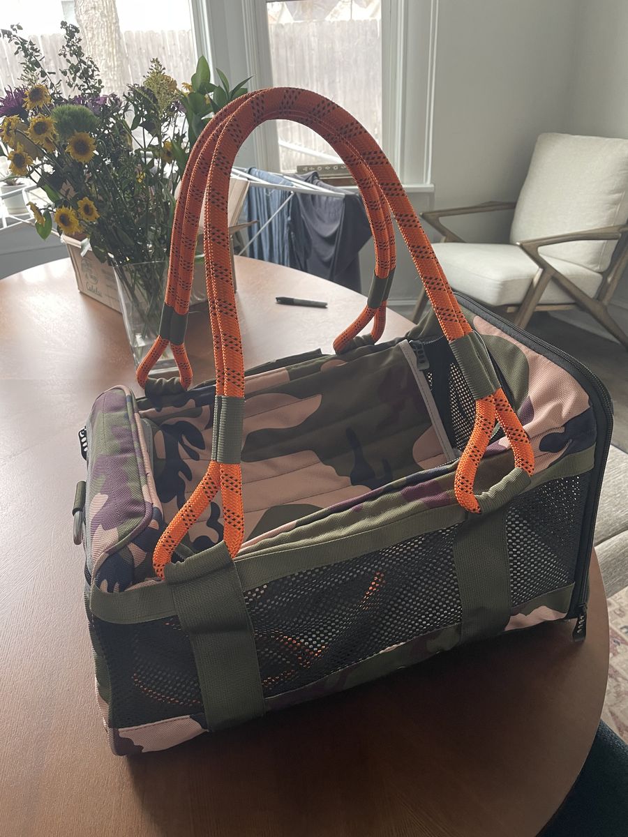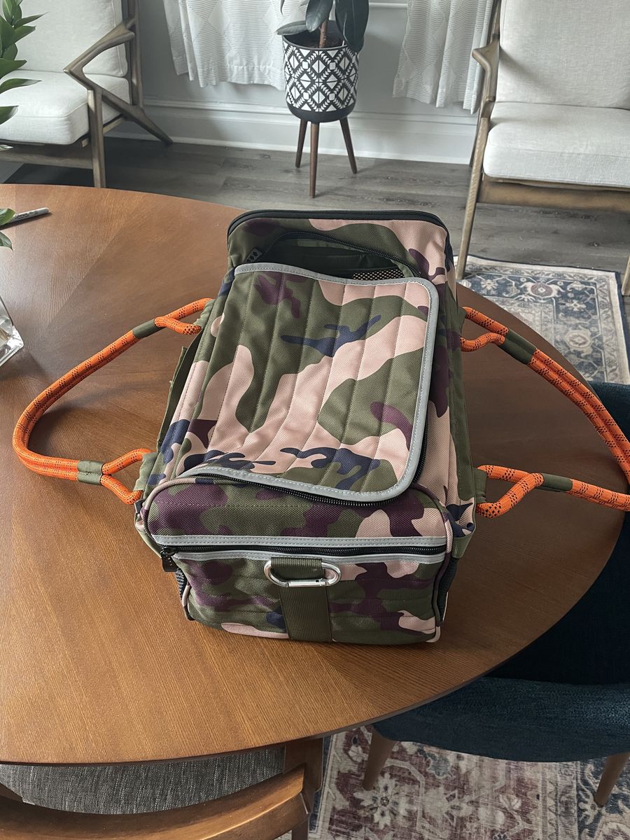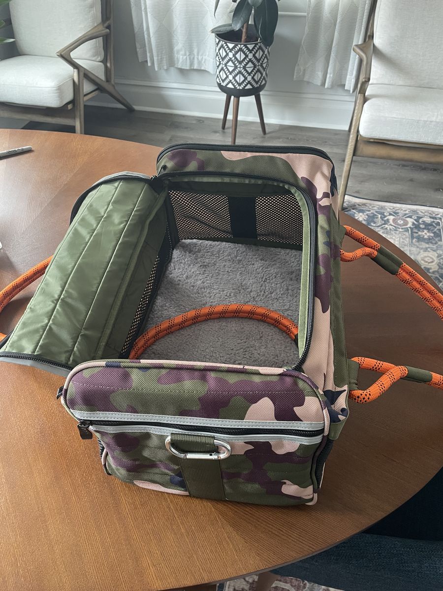 OUT-OF-OFFICE PET CARRIER PRO EDITION size large. Dimensions are in the pictures. Bought it to use for one airplane trip however our dog was too large for it. Our loss your gain. 125 OBO