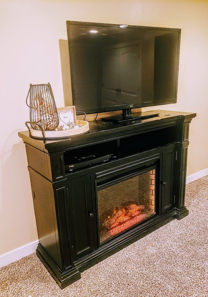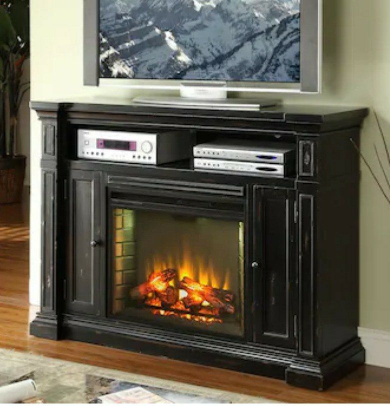 Legends rustic black fan forced electric tv stand/fireplace with remote control. Solid wood, furniture board, premium veneers. Antique iron hardware. Open & closed storage compartments. (TV not included).