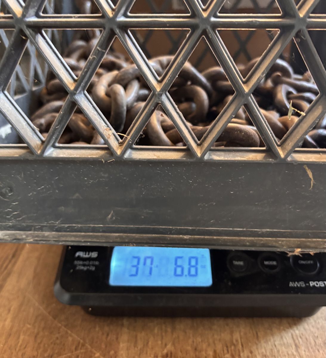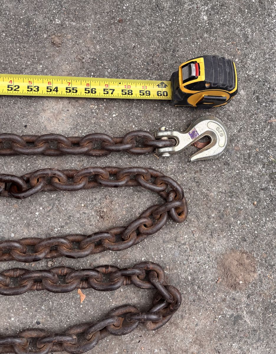 VenmoSteel Logging Chain, not alloy, 3/8” links. Full length 23’6” (true w/o hooks, they’re included), 37lbs. Don’t know the actual load strength, but this was the strongest available many decades ago. I’ve had these since I worked actually doing logging sometime, other times, pulling vehicles out of ditches, in upstate New York. The hooks are new, just your standard hardware store variety, Comes with handy carrying cast, as pictured.