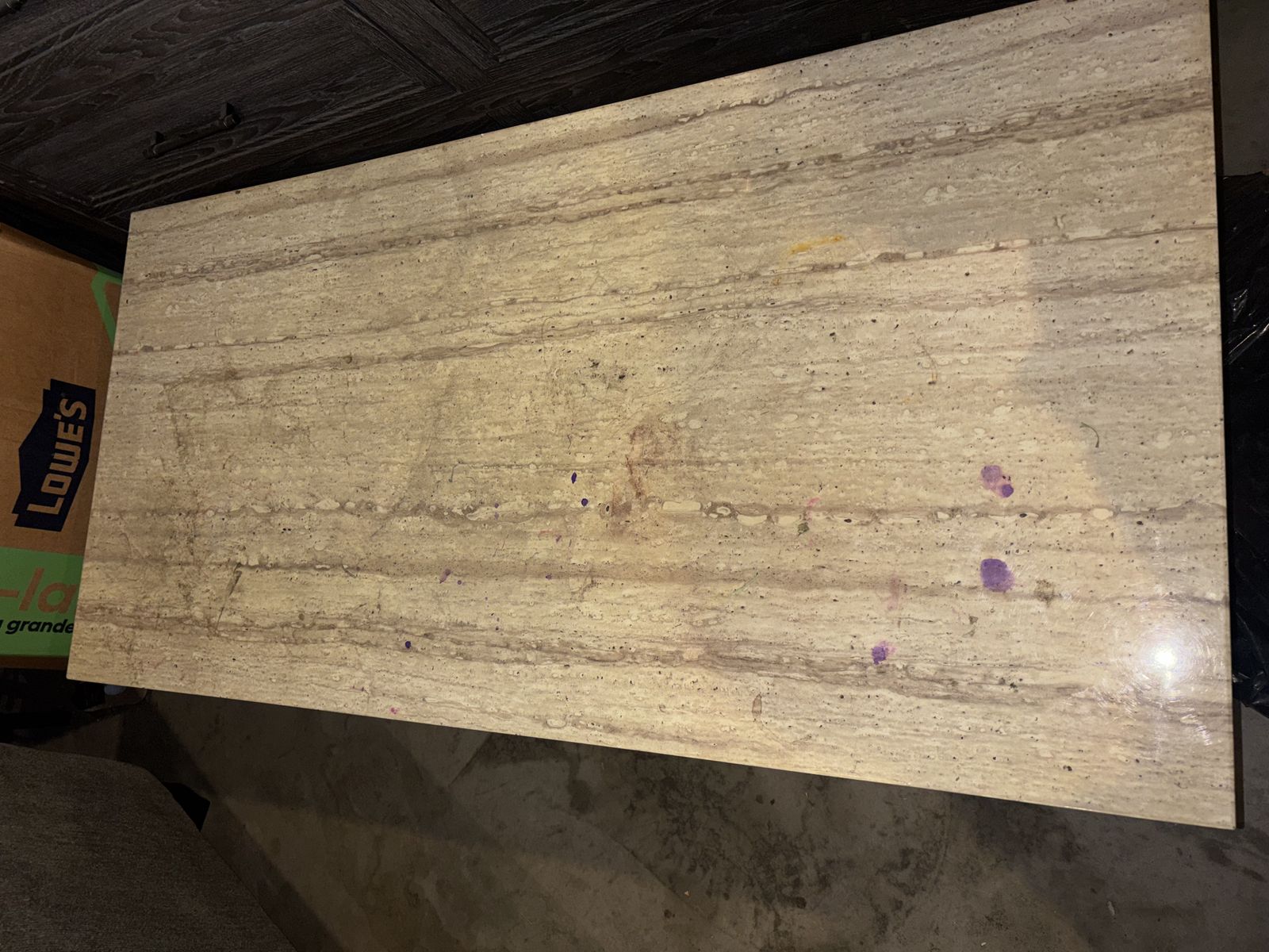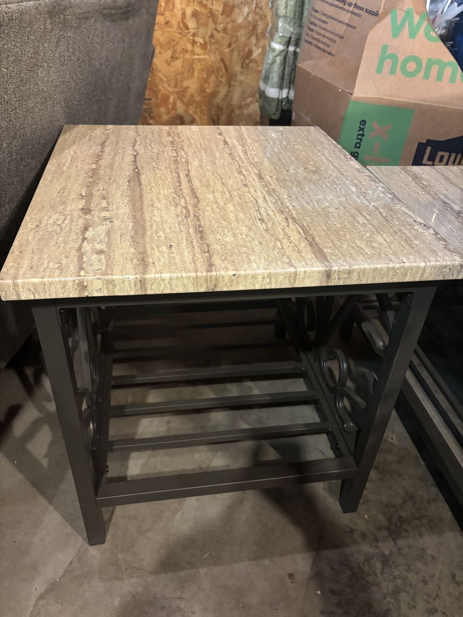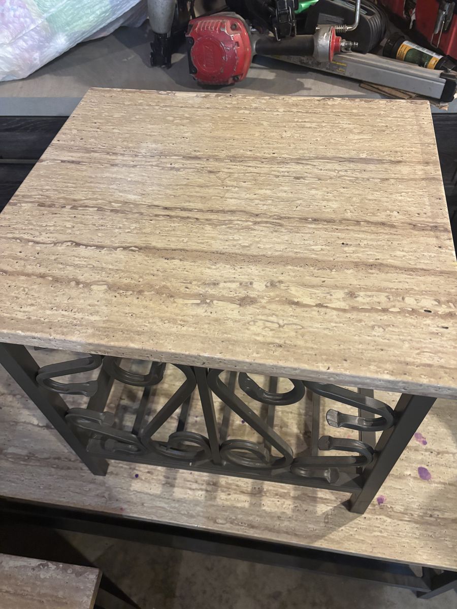 Marble tables for living room include 3 (1 medium and 2 small) the medium table has some small purple stains but other than that they have no other details.