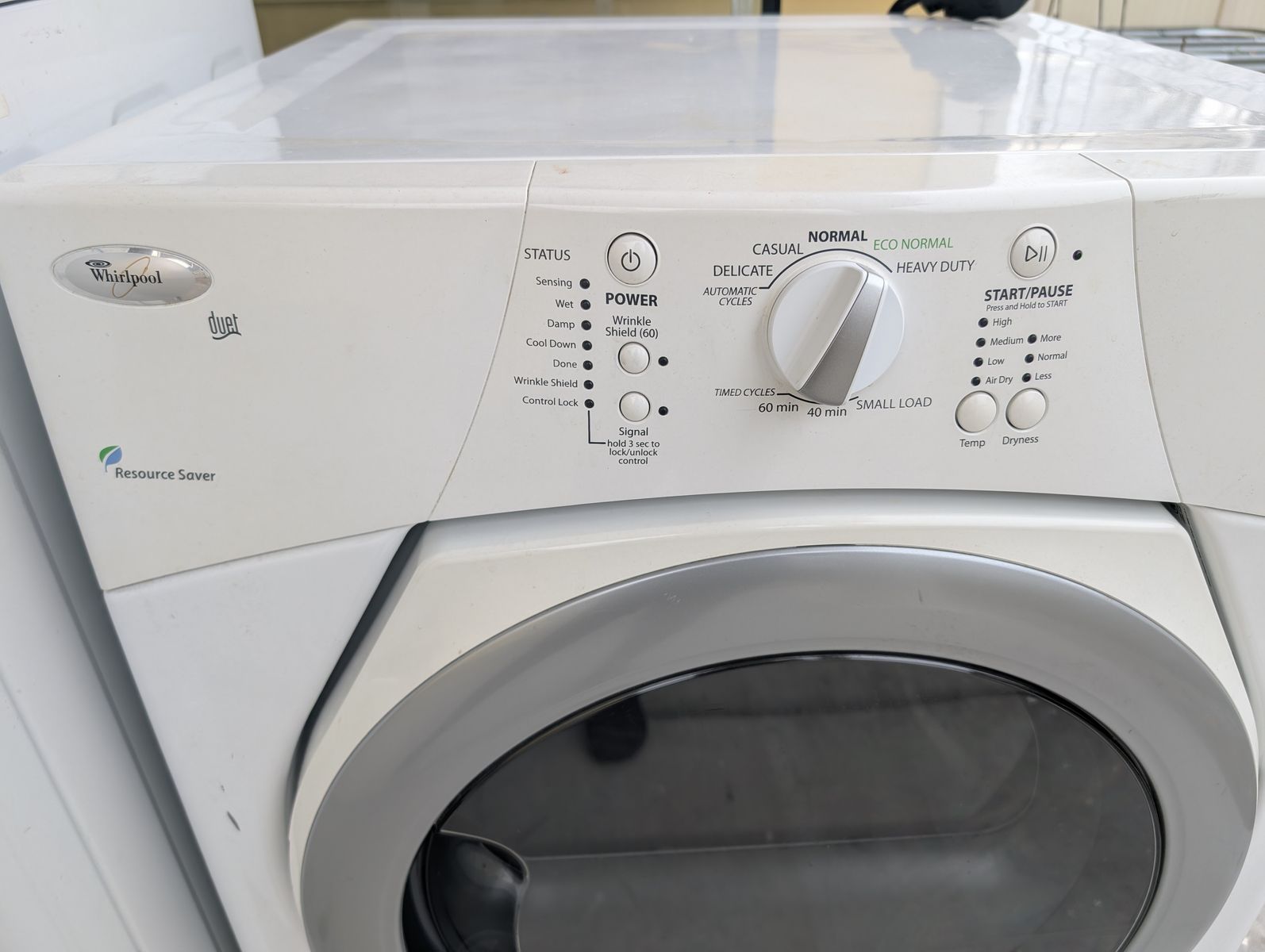 VenmoWhite Whirlpool Duet WED9150WW1 electric dryer available. This front-load dryer has a Resource Saver feature. It comes with different cycles like normal, casual, delicate, and heavy duty. Also has timed cycles and options for temp and dryness settings. Works wonderful and just received a new heating element Fcfs