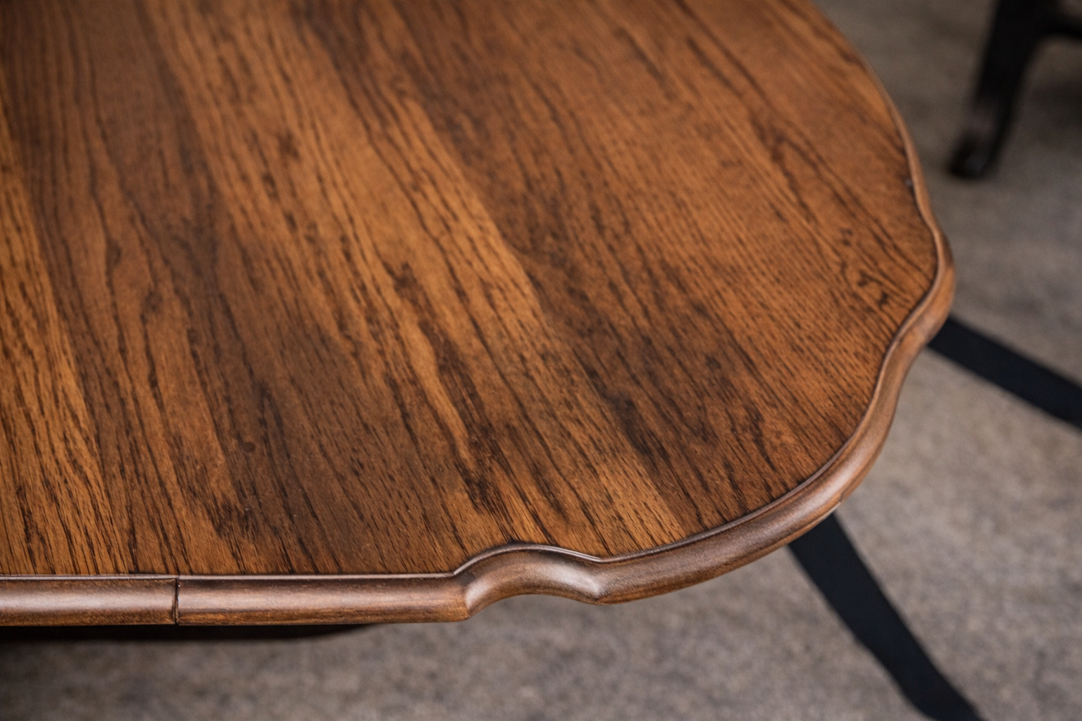 The table features a shaped /scalloped oval top that highlights the natural oak grain and gives the piece a classic, elegant look. The base and chairs have been refinished in a deep black finish that contrasts beautifully with the warm oak tabletop.