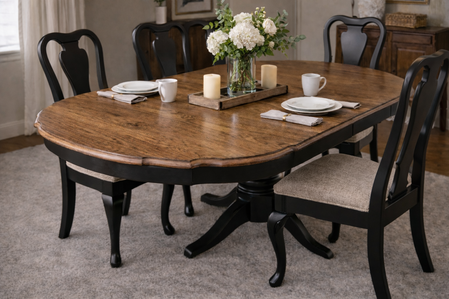 The chairs feature Queen Anne style cabriole legs and neutral fabric cushions that complement the table perfectly.