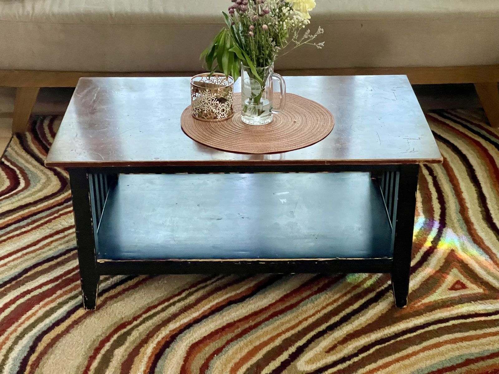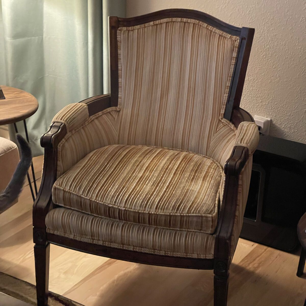 ️️DESIGNER FURNITURE & RUGS • Beige Sofa ($550): 3-seater, deep and comfortable. (Minor 1 tear on left cushion). • Ethan Allen Coffee Table ($400): Solid wood, heirloom quality. • Ethan Allen Table Lamp ($175): Bronze open-frame designer piece. • 3-Panel Shoji Room Divider ($65): wood frame, excellent condition. • Red Outdoor Circular Rug ($90): Geometric pattern, very durable. • Blue Cloth Wingback Recliner ($40): Super cozy classic style. • Vintage French Provincial Chair ($90): Striped velvet and carved wood.
