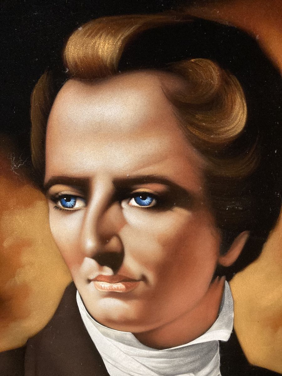 ZelleClassic image of the Prophet Joseph Smith, oil on black velvet, framed in a sturdy wooden frame. Outer dimensions of the wooden frame: 43 x 31 inches. This painting was produced in Mexico some 40 years ago.