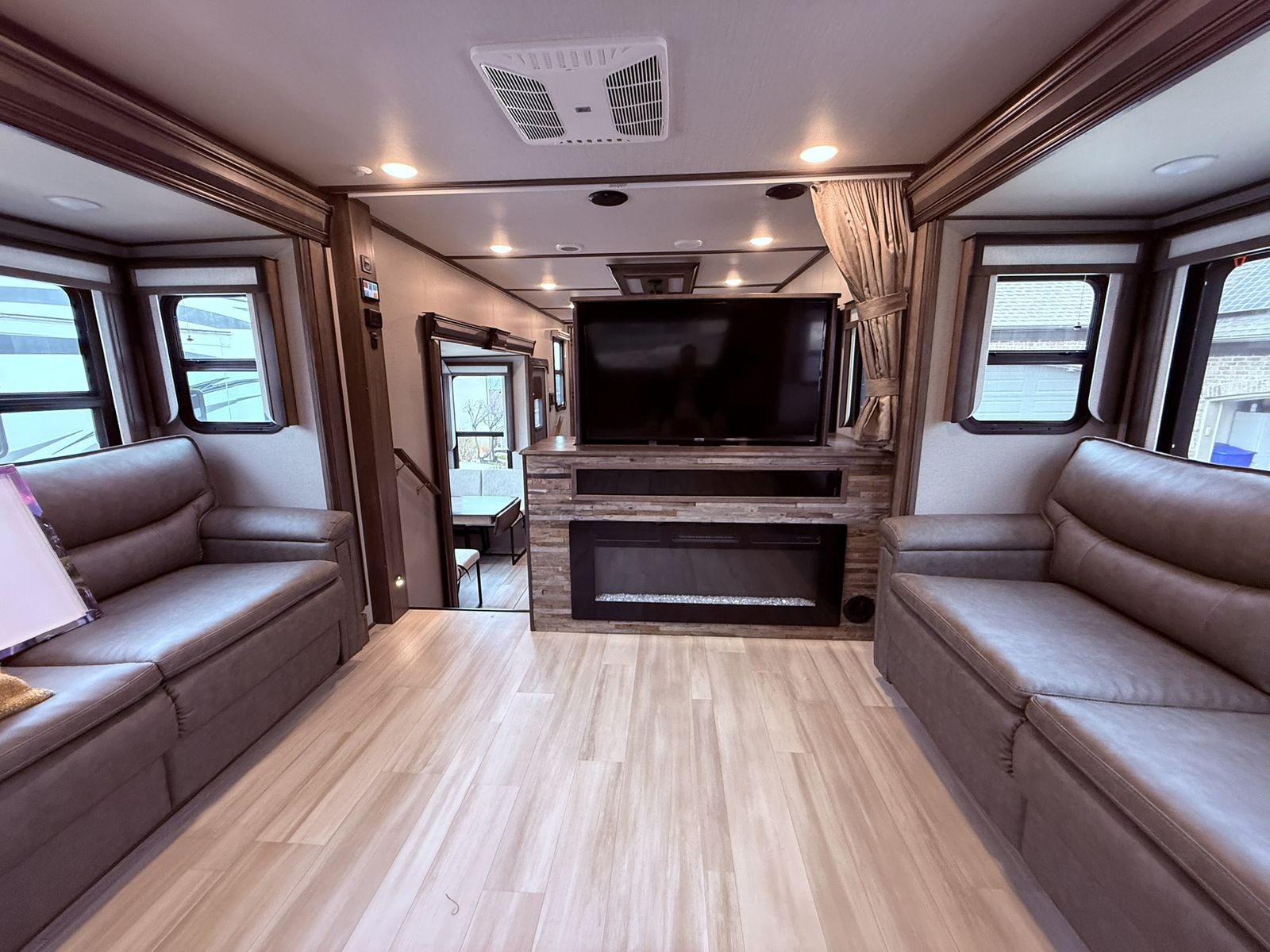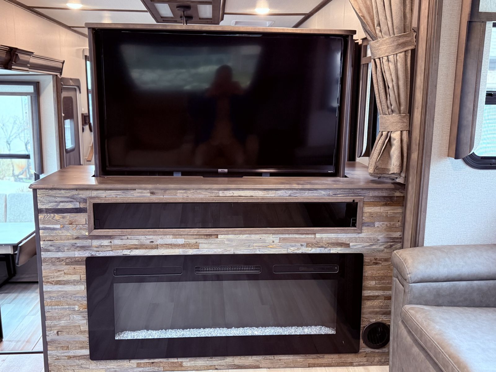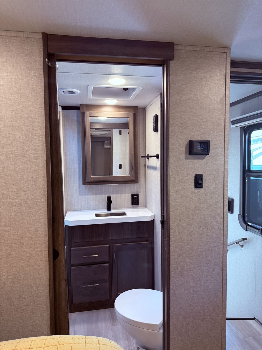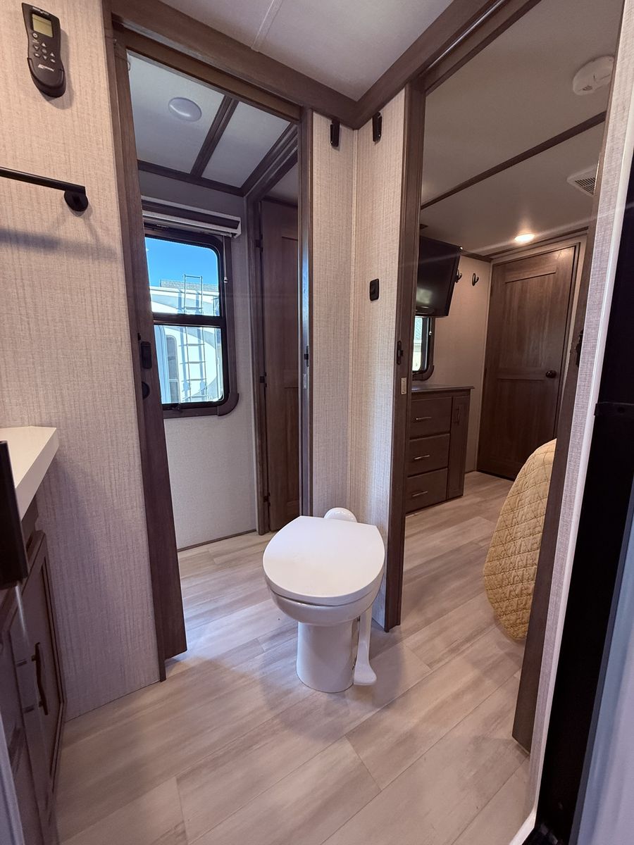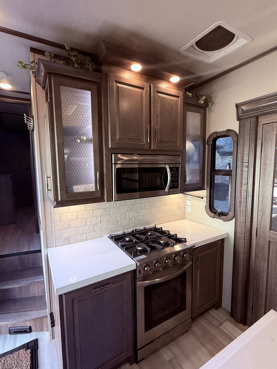 This model is perfect for those looking for a full living RV that offers all the comforts of home on the road and under 40 feet in length. The 346FLS floorplan provides a large front living area that includes a 50" smart TV two tri-fold sofas, two auto recliners. The kitchen is equipped with modern appliances and ample storage space for all your cooking needs. The bedroom features a king size bed and plenty of storage options for clothing and personal items.