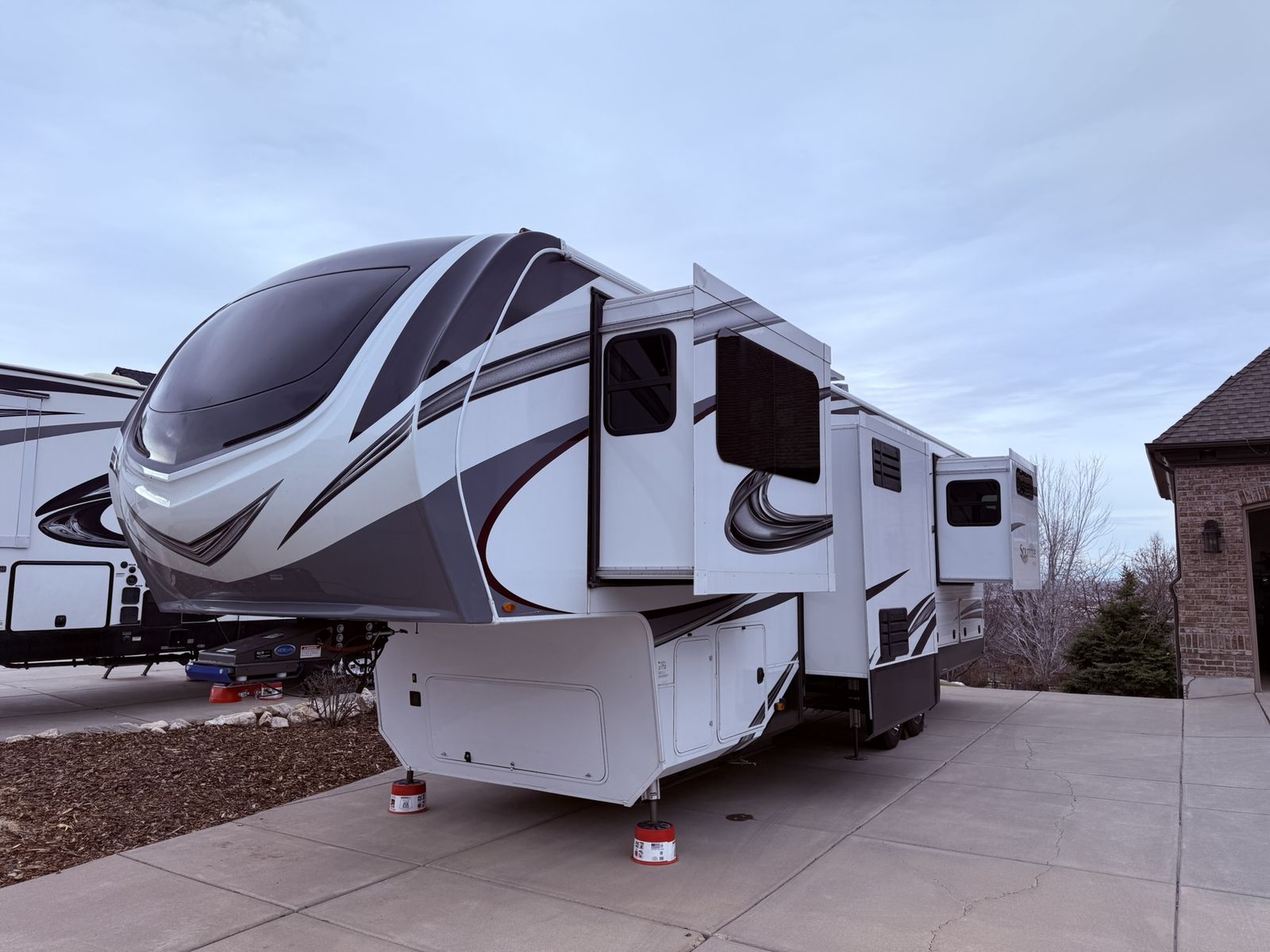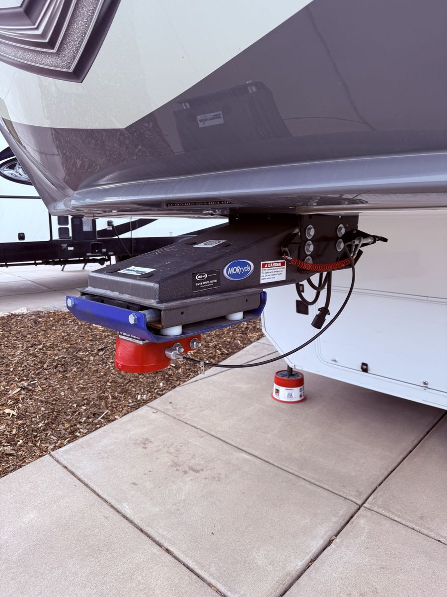 A brand new roof was just installed in February 2026. The underbelly is heated to ensure that you can travel in all seasons. The RV is equipped with 6 point hydraulic leveling system, heavy duty 17.5 H-rated Tires w/nitroFill. Spacious front pass-through storage and large basement rear storage including slide out tray. The RV has 5 slide-outs - Two are hydraulic and three frame electric (Schwintek). Also has two power awnings camp side.