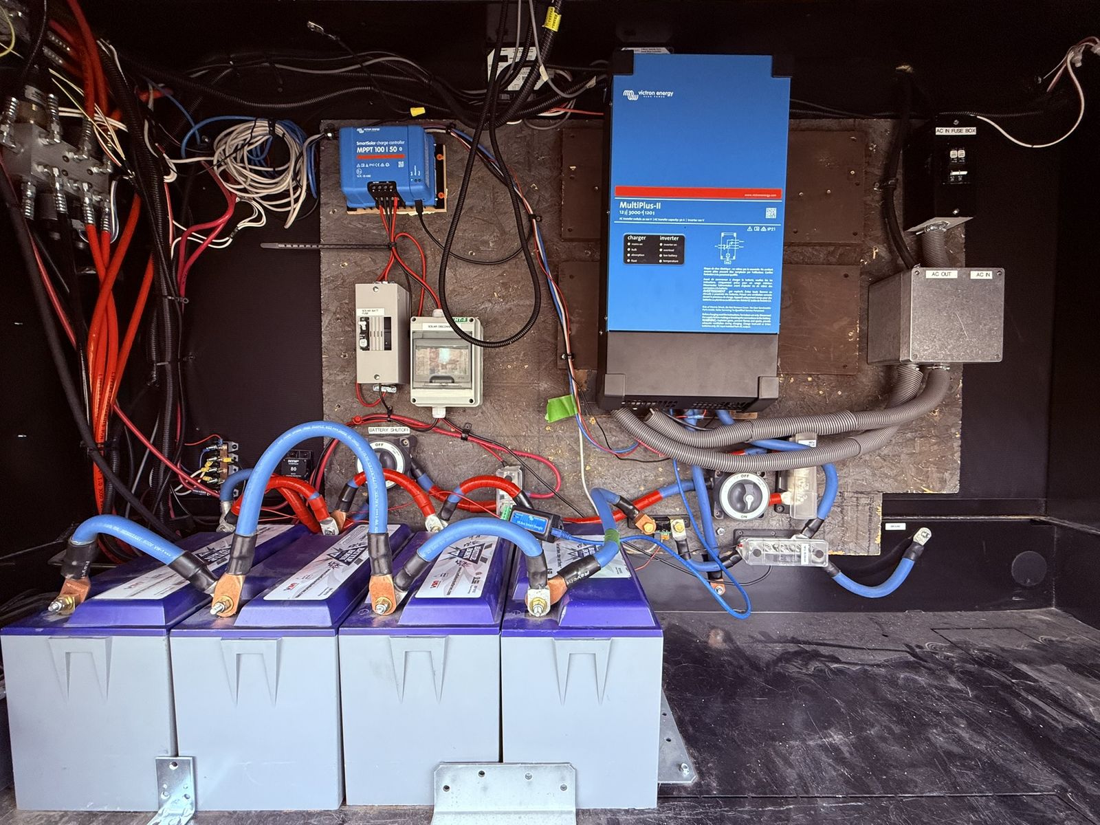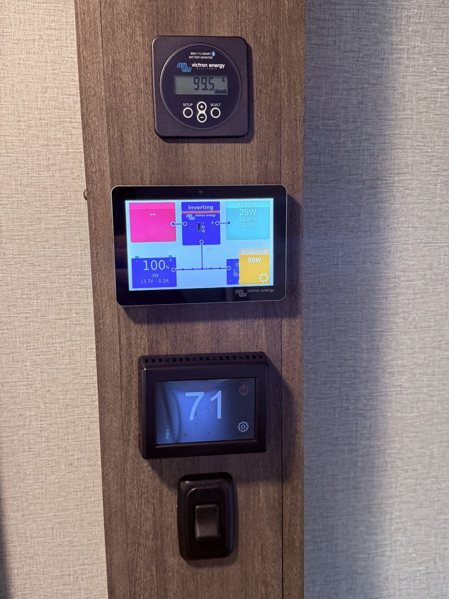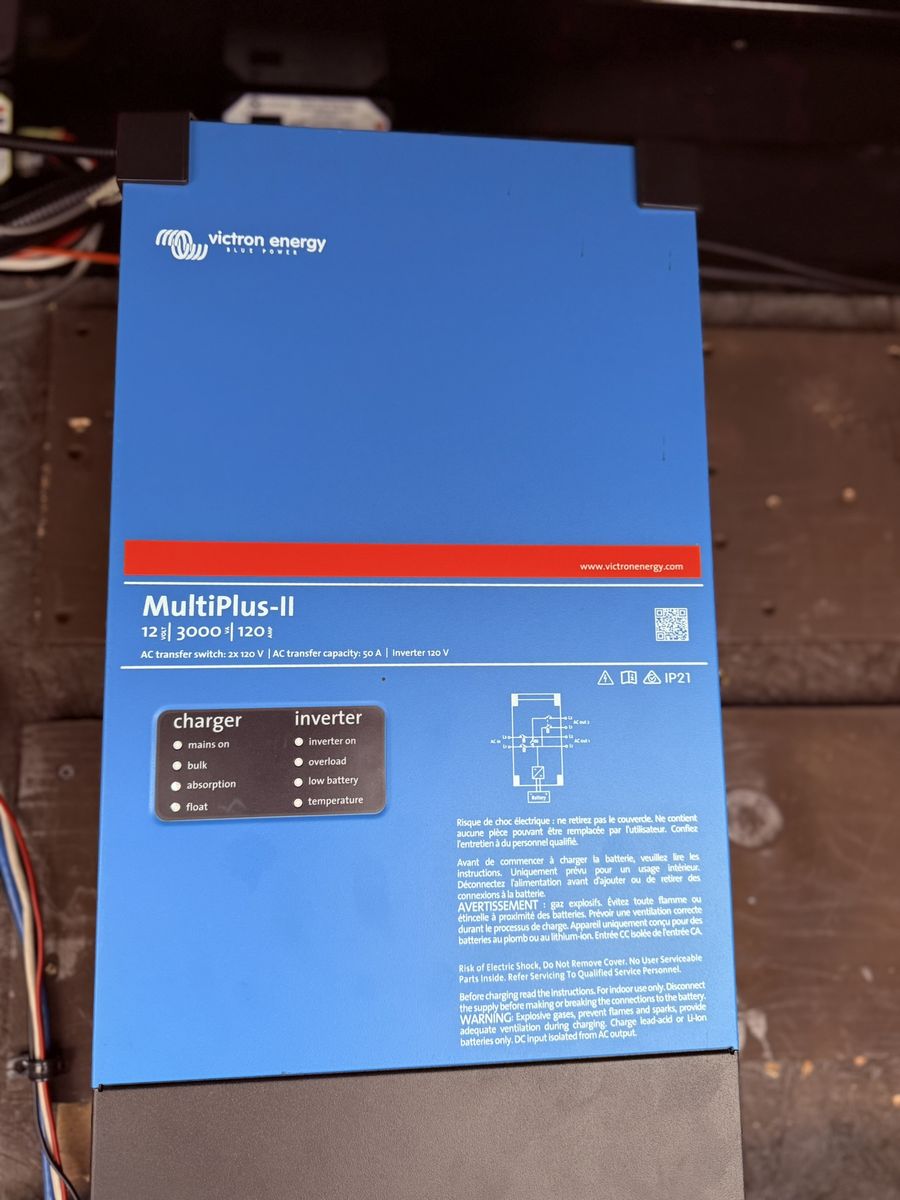 Full Victron Power system: Victron multiplus II 12/3000/120-50; Smart solar charge controller MPPT 100/50; Battery monitor; Cerbo GX Communication Ctr.; Victron GX Touch 50 panel. Entire RV can run off battery inverted power. This system cost over $12,000 installed by owner.