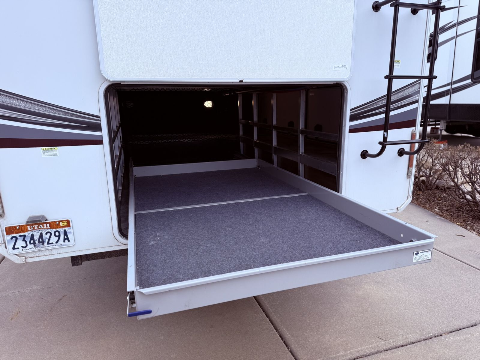 · Rear exterior storage bay with slide-out tray for bikes, golf clubs, tables etc.