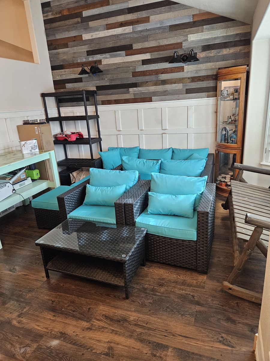 Patio furniture in great condition. Used for one occasion and has been in storage since. Comes with a three person couch, two person couch, two single chairs, two ottomans, coffee table, second set of covers in dark blue, and covers. Asking $500 cash only o.b.o