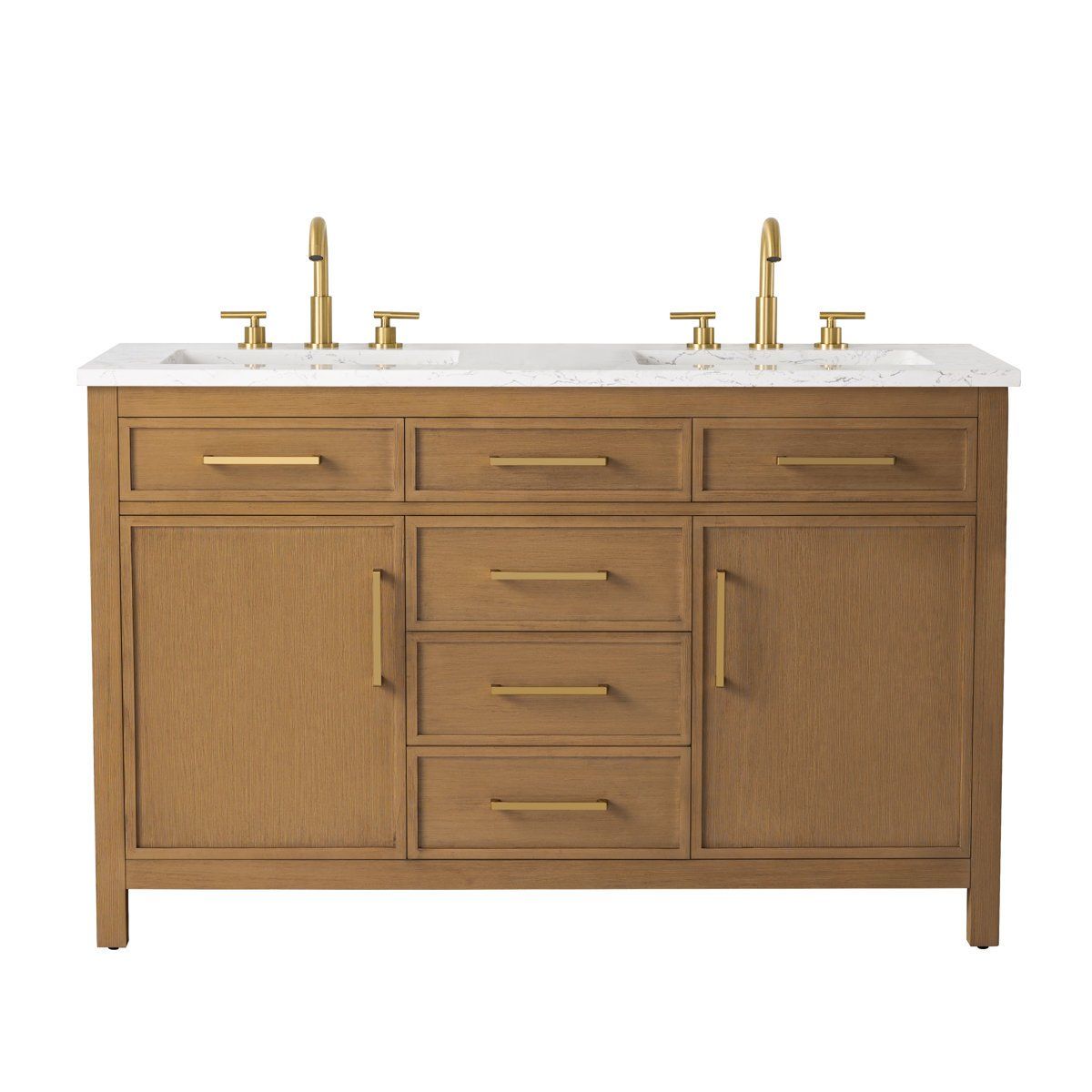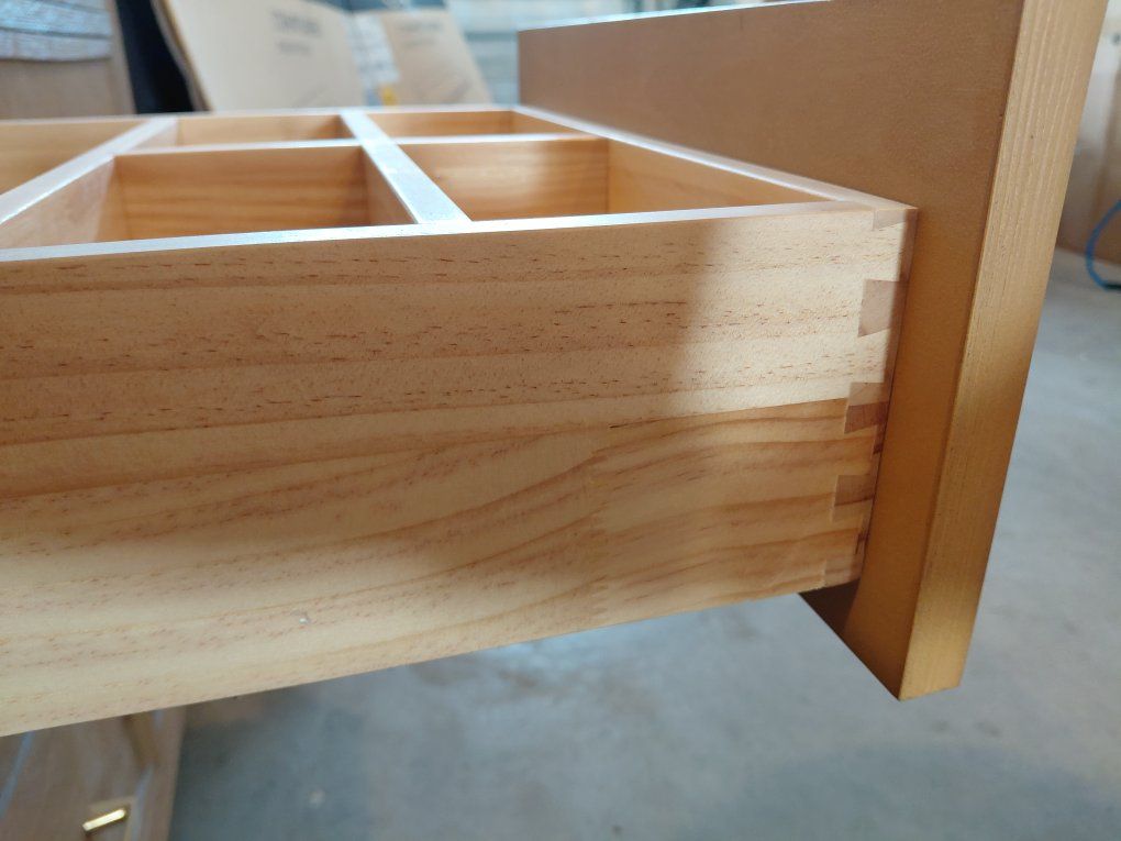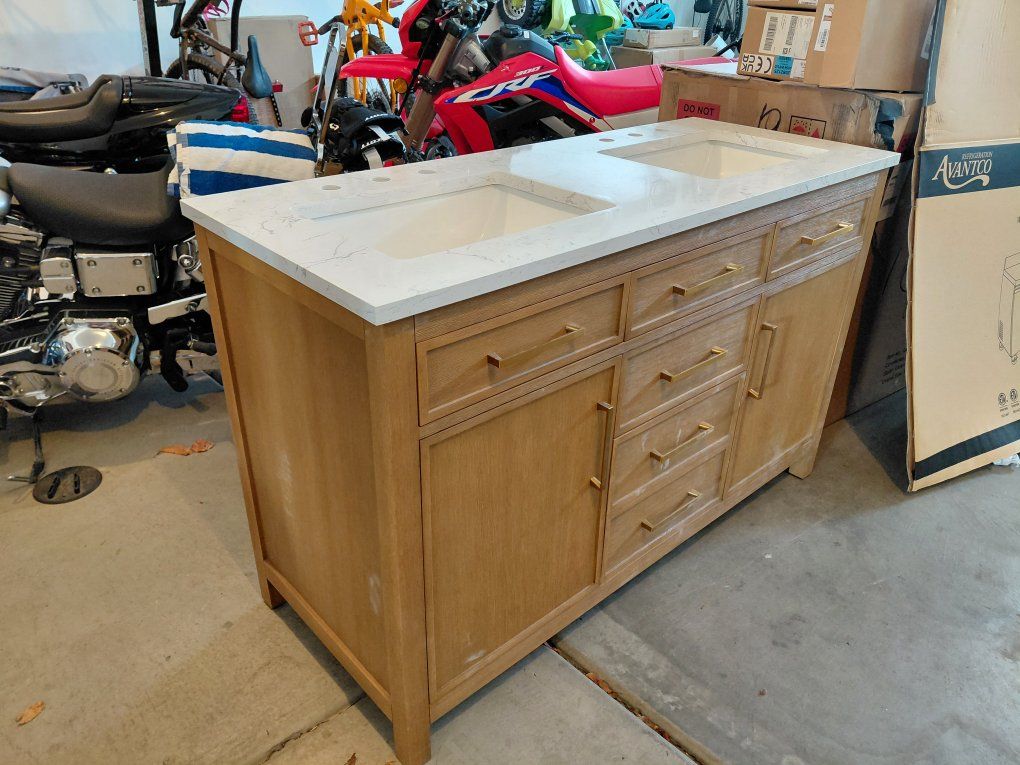 I have two brand new designer vanities. Brand new condition never used. One in box and one out of the box. They were unfortunatly juat barely too big for pur project. Crafted with durable solid wood. Beautiful Carrara White stone top. The color is a really pretty caramel. This vanity has stylish rectangular undermount sinks and spacious storage for towels, toiletries, cleaning supplies, and other essentials. Paid over $3000 after tax and shipping. Sad we couldn't use them theyre beautiful and very high quality.
