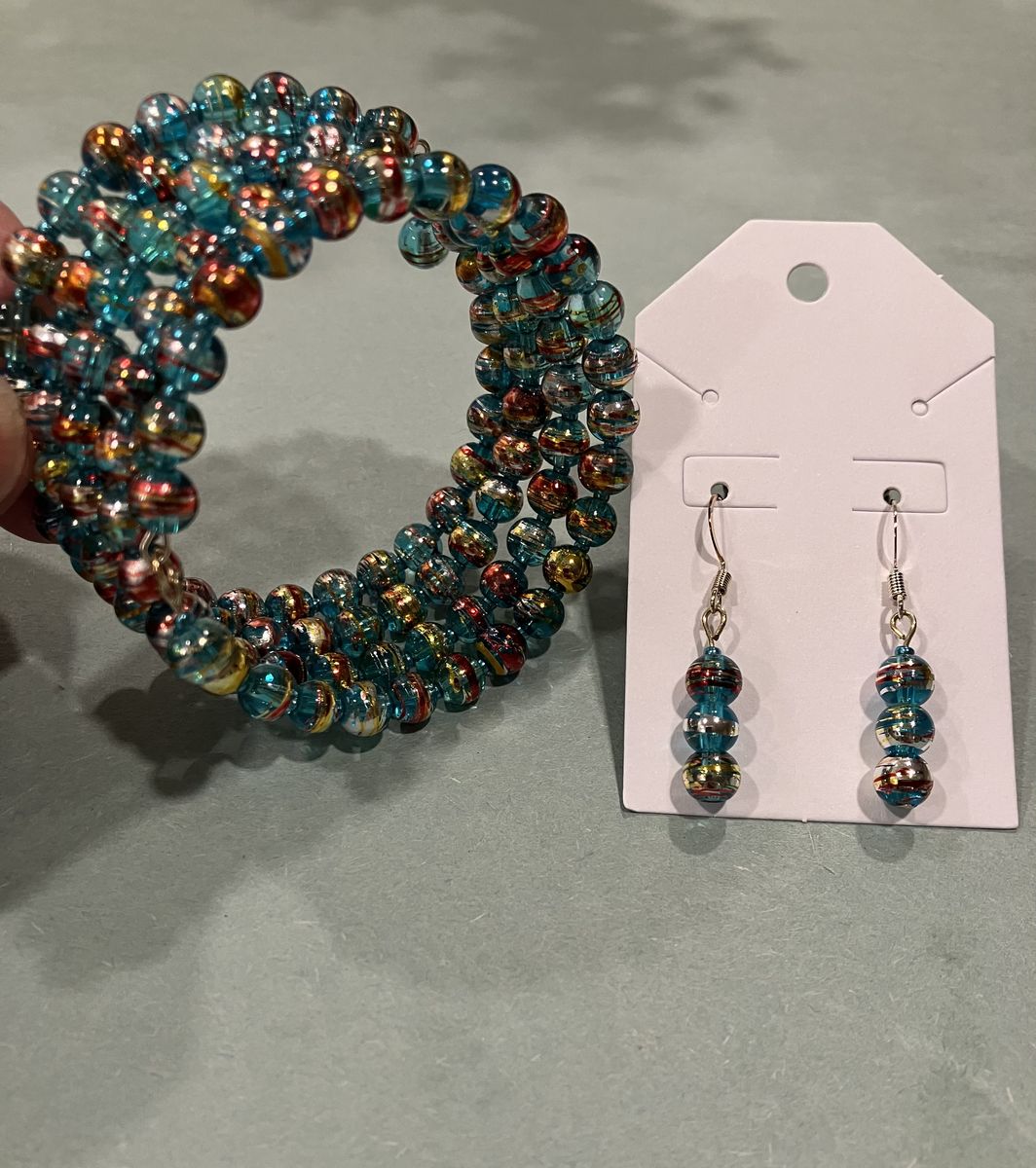 VenmoHand made, vibrant blue, gold and red multiple coil, glass beaded charm bracelet and matching earrings. Fits a wrist size up to 6.5 inches. Earwires are gold plated. Gift box included. Local meetup or can mail with ship fee.