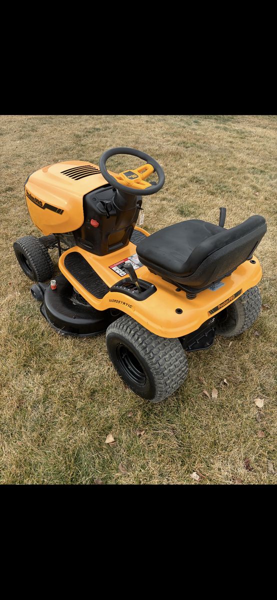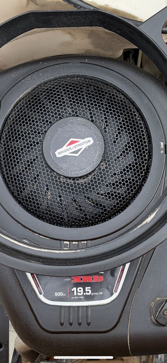 19.5 hp 42 inch deck Has a new battery runs and work great. Hydrostatic transmission