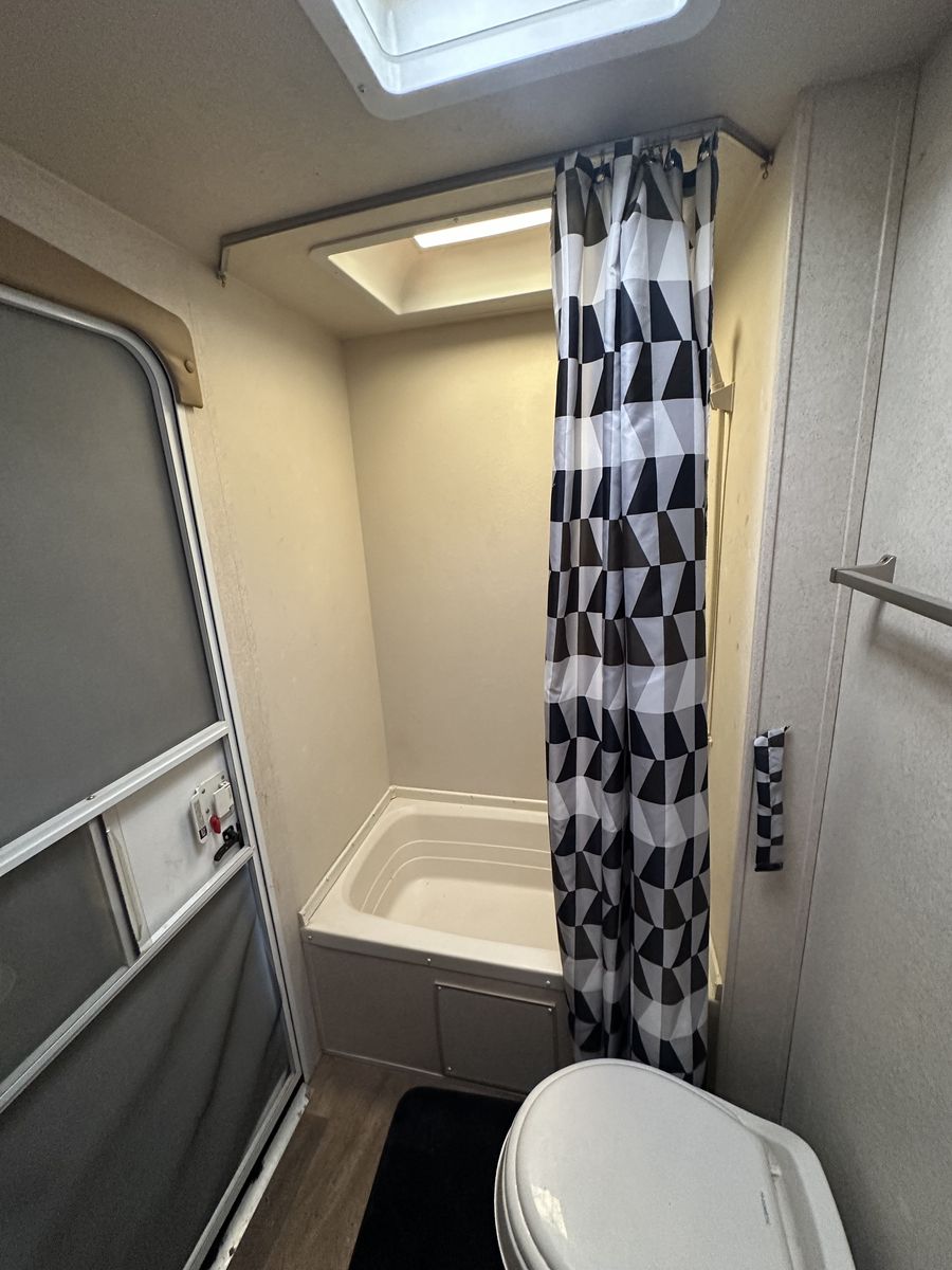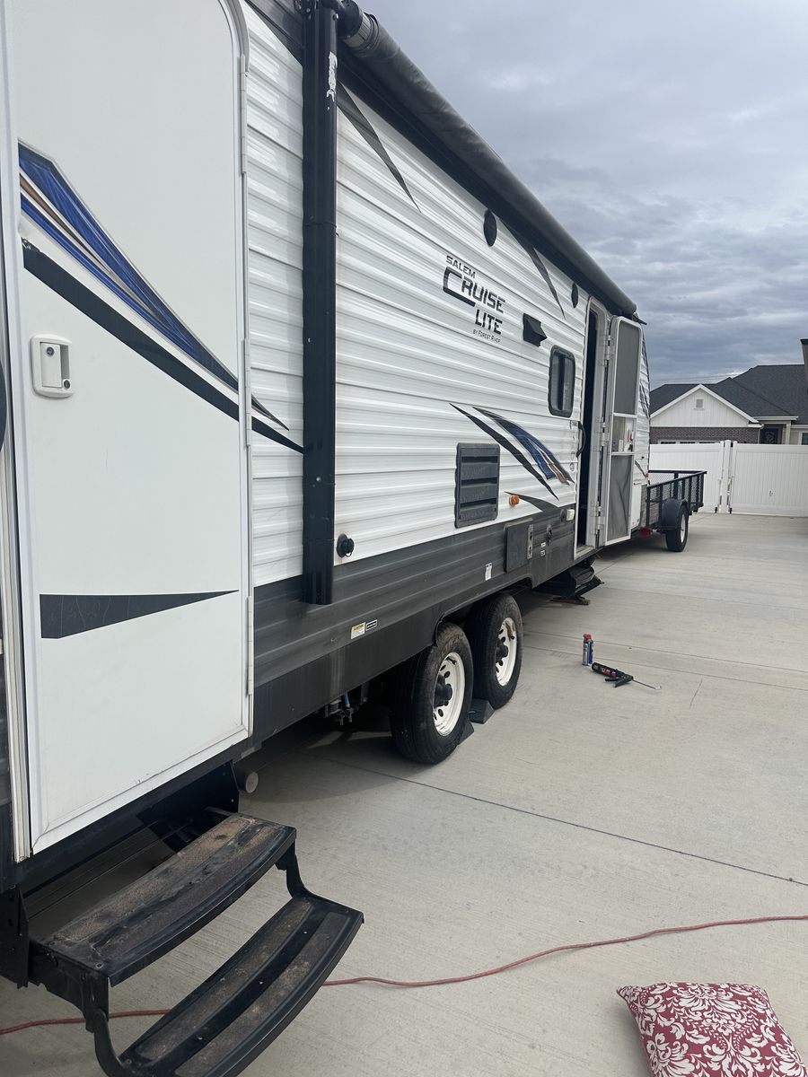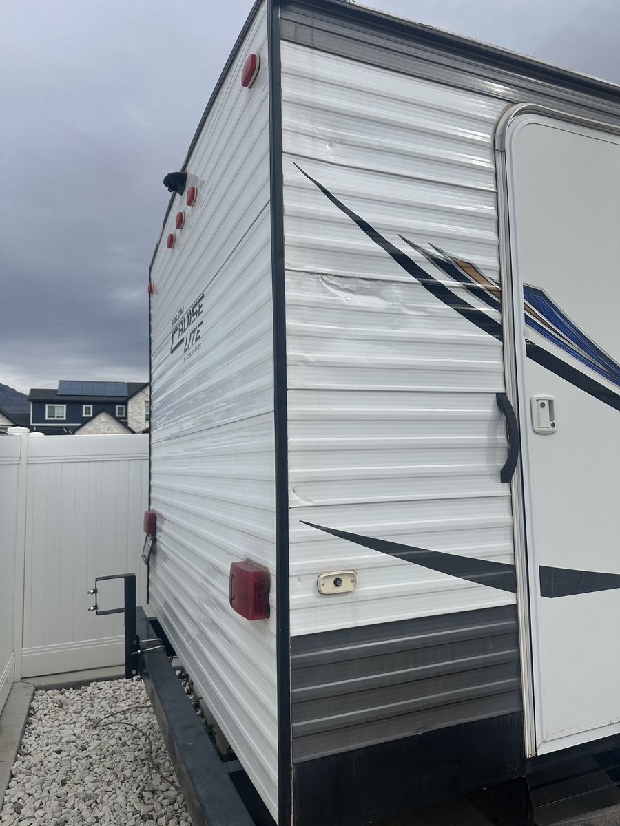 This is a well used and loved trailer so it does have some flaws. -Needs a new battery -The awning arm is broken so will need to be replaced, but the Fabric on it is newer. -The Fridge won't turn on. -Has a small dent as shown in picture from husband scraping on a tree, It was fixed.