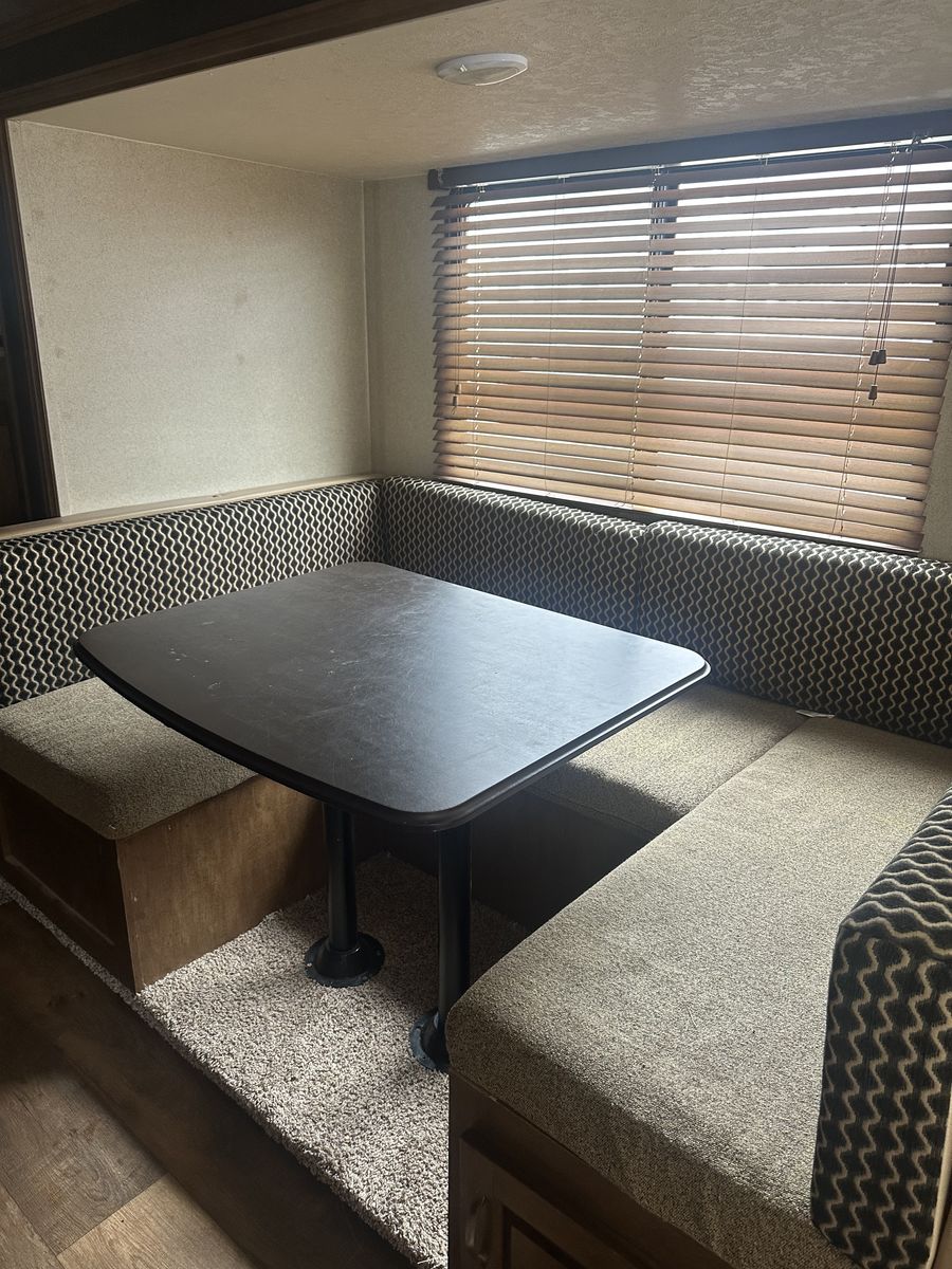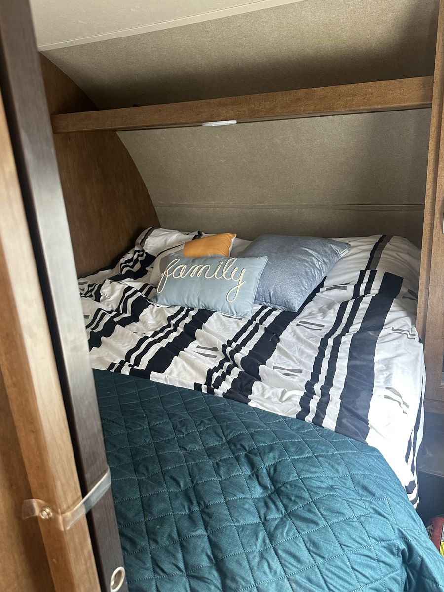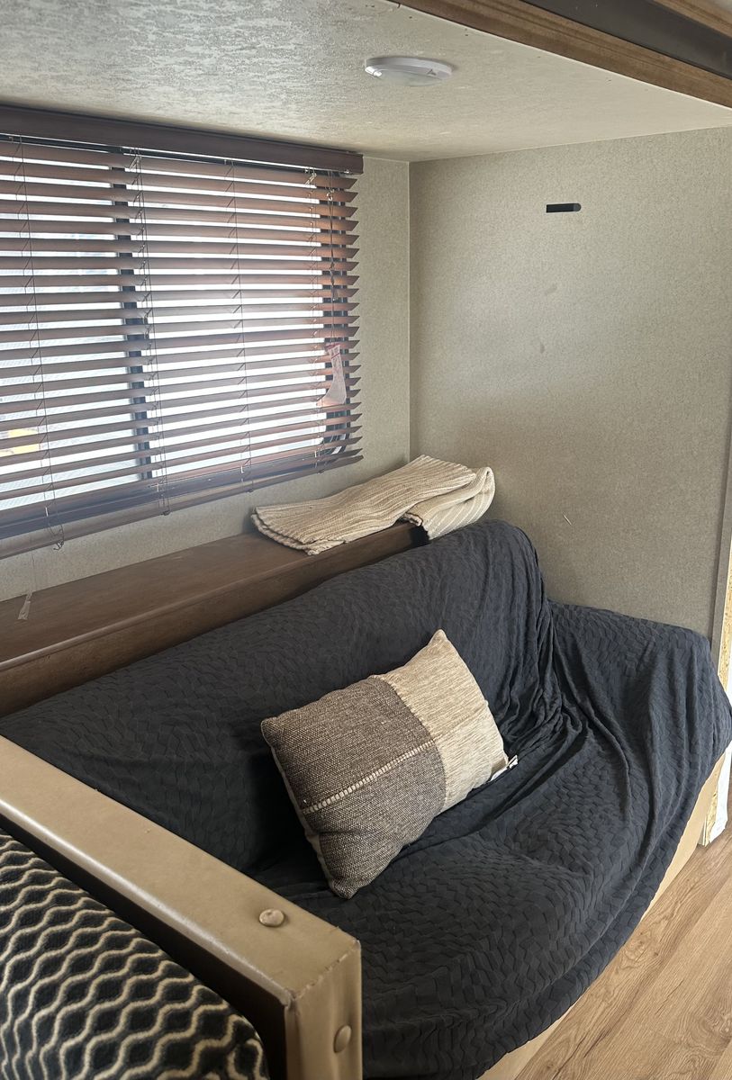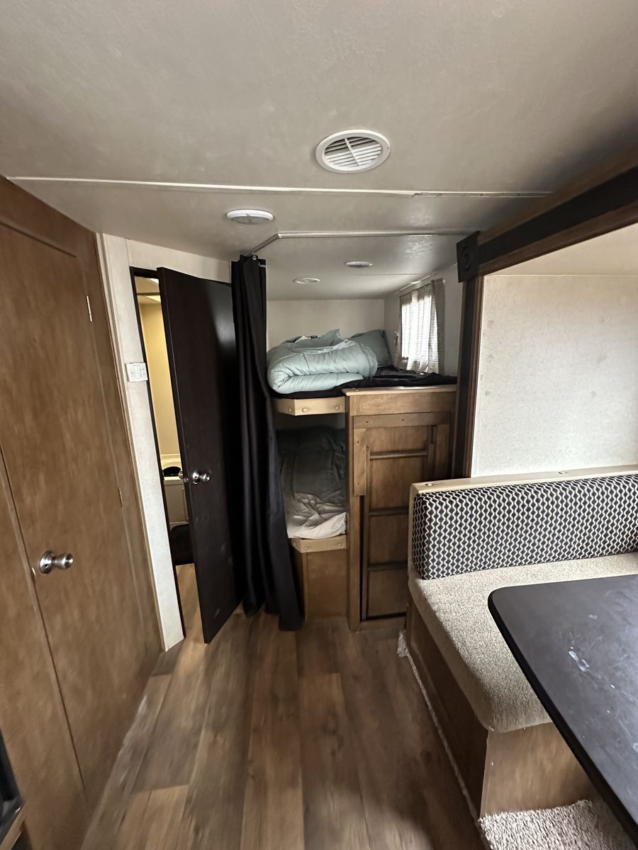ApplePayAwesome Spacious Travel Trailer with bunk beds in the back and a private Queen bed in the front. The couch is also a full size bed and the U-Shape dinette turns into a bed as well. Can easily sleep 10. Has speakers outside, and lights. Including 2 Generators