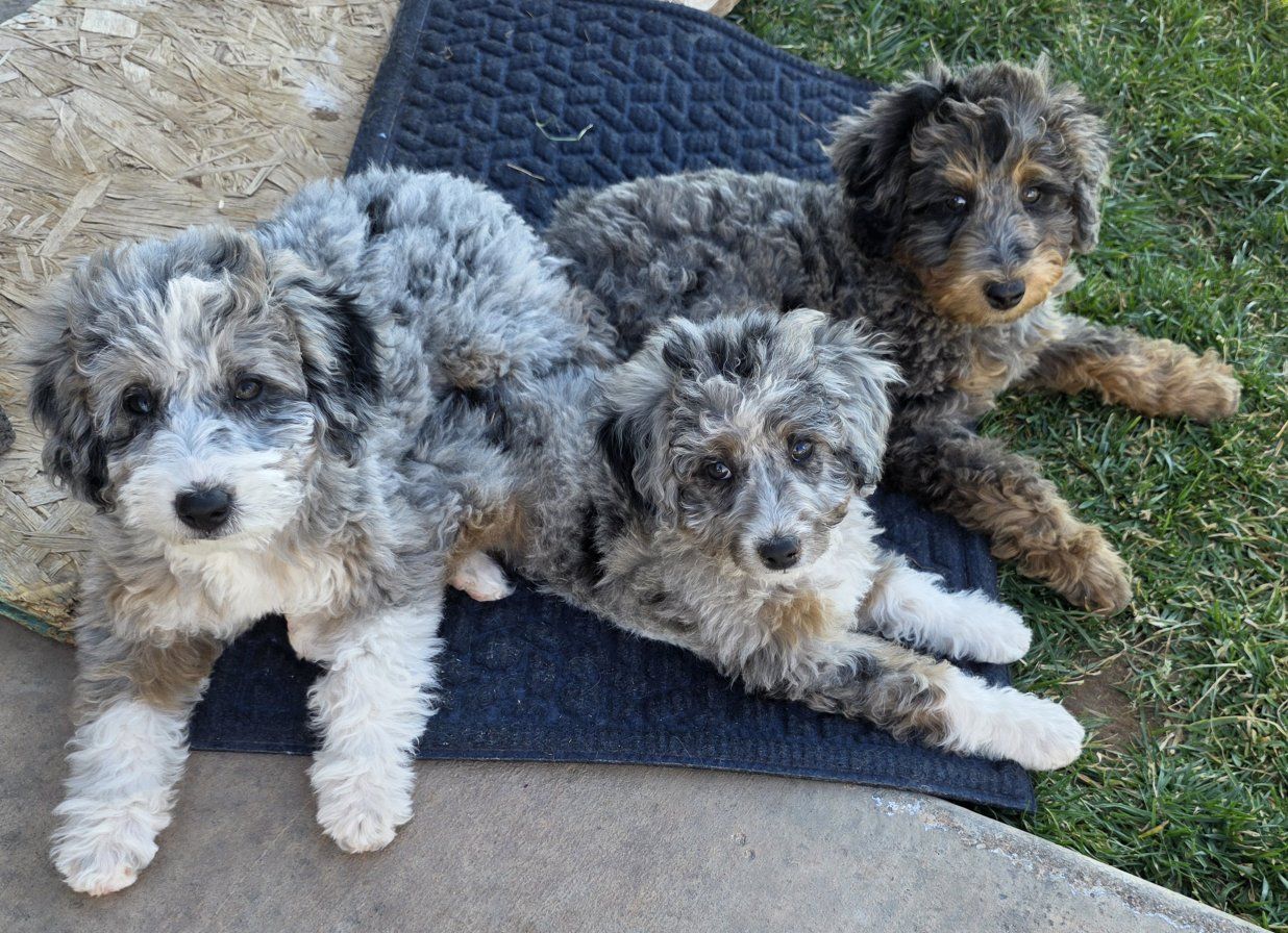 ZelleDaisy will be on the small side. She's around 5.5 lbs half her siblings size. HER COLORS ARE AMAZING. So sweet. moms half poodle, half aussipoo. Dad is 100% Poodle born January 1 2026 pics with brother and sister. she has her 1st and 2nd series of shots 250.00 value