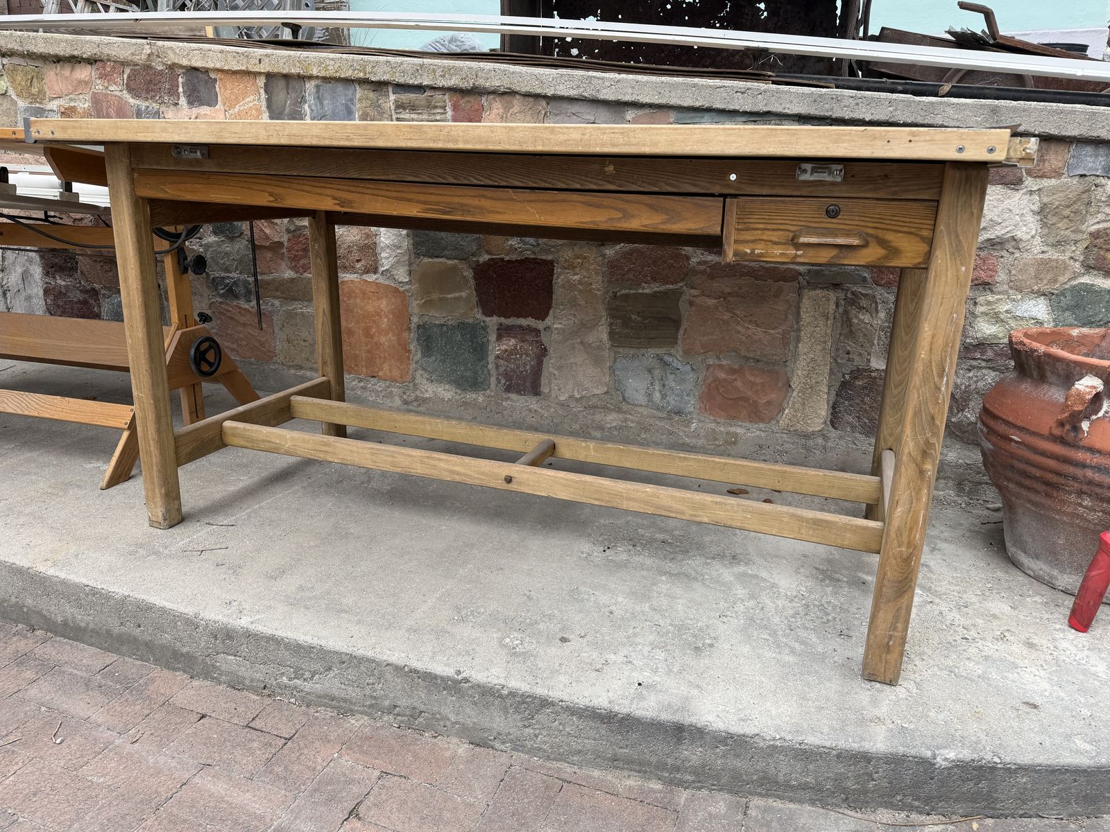 Nice oak drafting table. Adjustable angle. Includes a glass top
