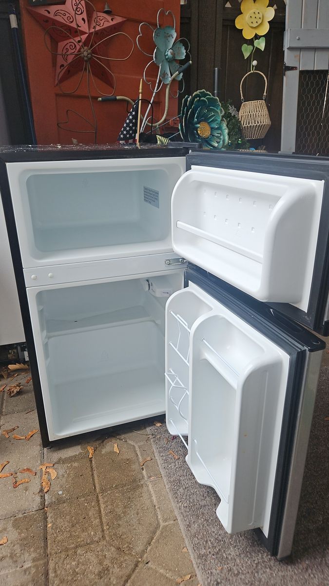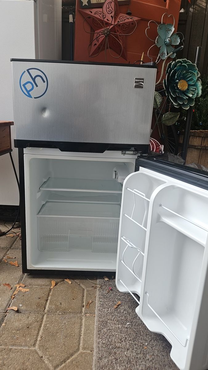 Kenmore 3.2-cu. ft. 2-door compact refrigerator in silvertone/stainless steel. Capacity: 3.2 cubic feet total, featuring a separate top freezer compartment.Features: It includes mechanical temperature control, adjustable glass shelves, and a clear crisper drawer. Design: It has a compact, flush-back design with reversible doors for flexible placement in small spaces. Usage: It is ideal for storing drinks, snacks, and frozen goods in offices, dorms, or garages