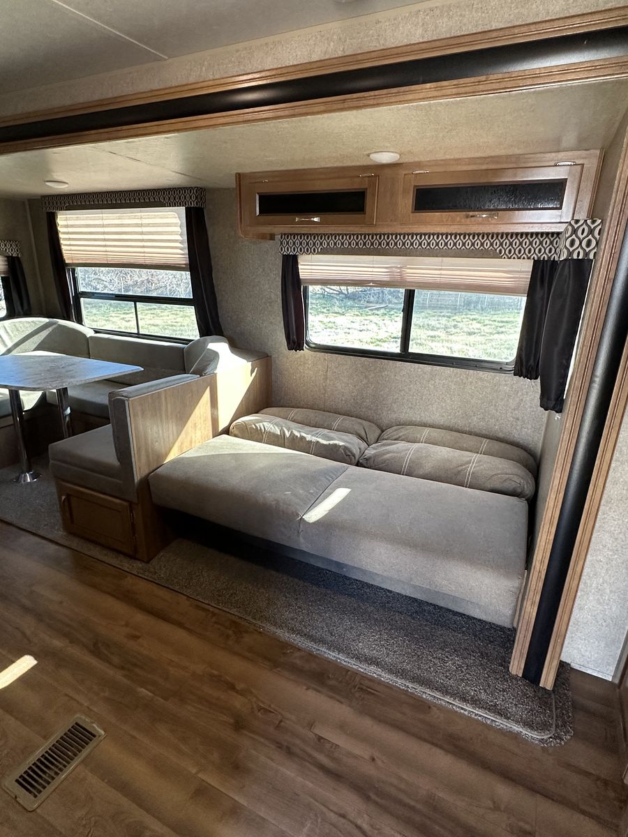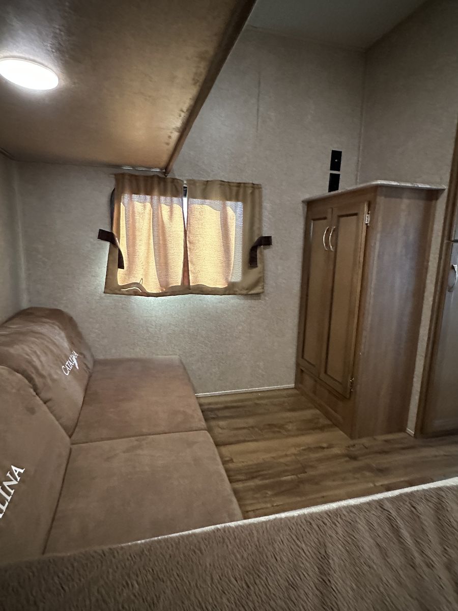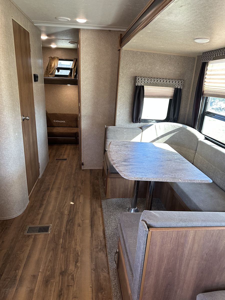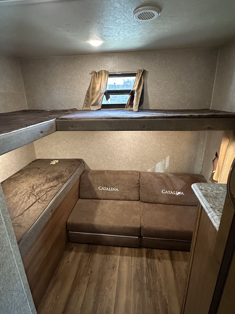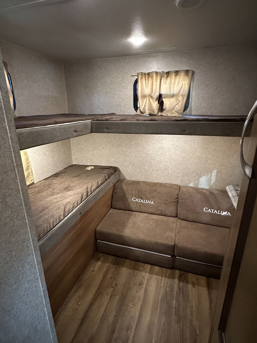 Spacious and family-friendly 2019 Coachmen Catalina 293QBCK travel trailer in great condition. This 33-foot bunkhouse floorplan and features a private bunk room, large U-shaped dinette, queen bed, and a roomy slide-out for extra living space. The trailer also includes an outdoor camp kitchen, large awning, and plenty of storage for trips with family or friends. Dry weight is around 7,200 lbs and overall length is about 33’8”, making it towable with many half-ton trucks.
