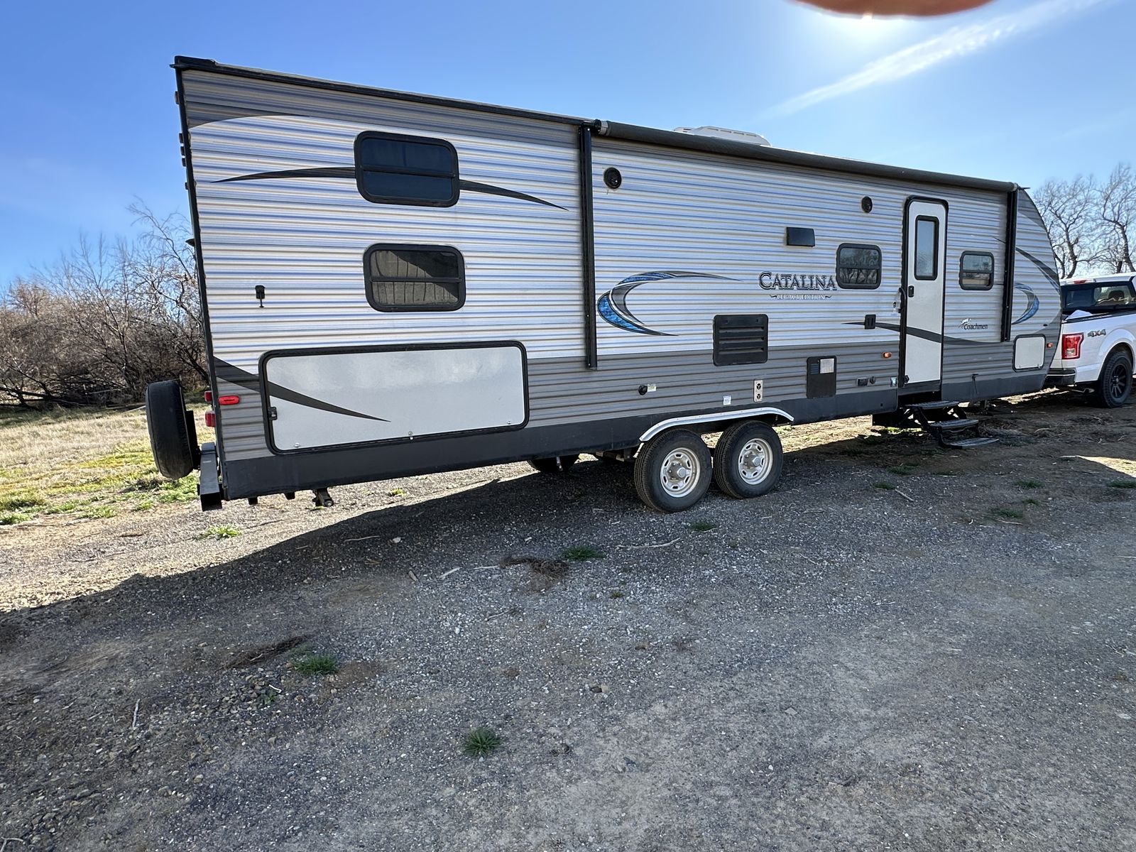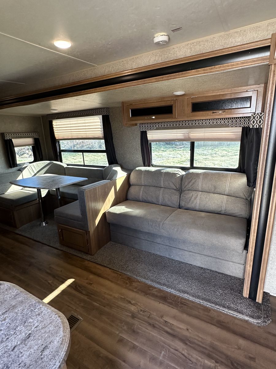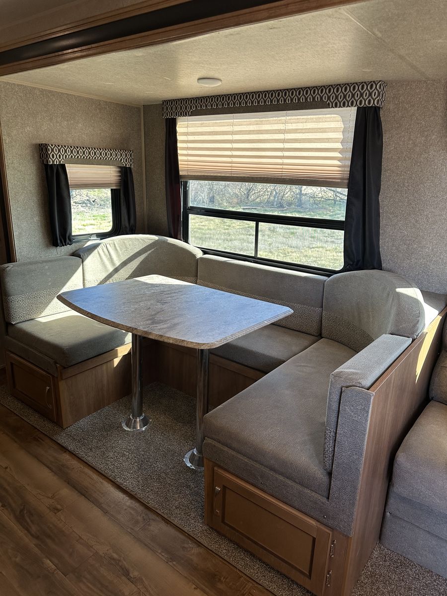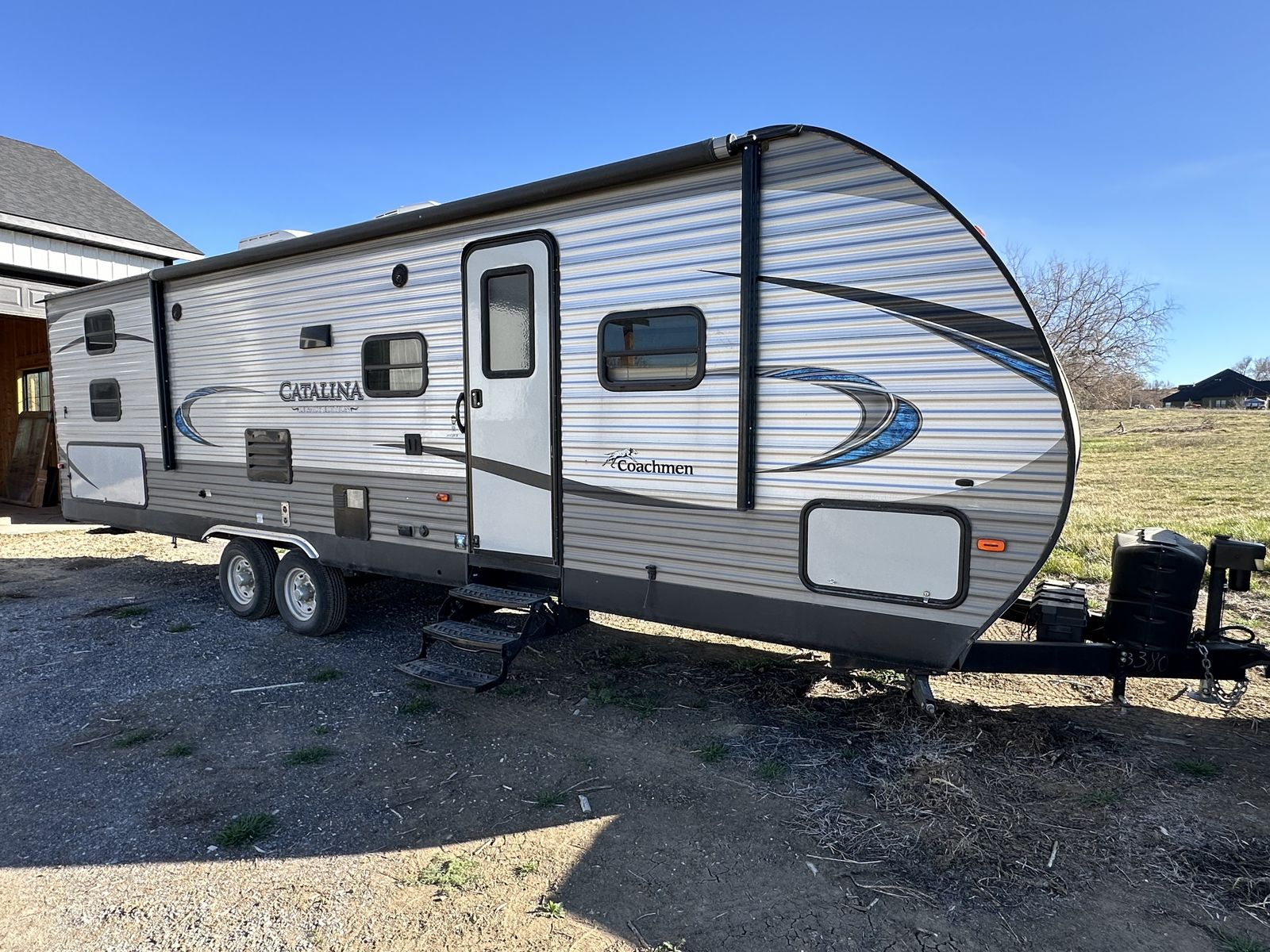 Spacious and family-friendly 2019 Coachmen Catalina 293QBCK travel trailer in great condition. This 33-foot bunkhouse floorplan and features a private bunk room, large U-shaped dinette, queen bed, and a roomy slide-out for extra living space. The trailer also includes an outdoor camp kitchen, large awning, and plenty of storage for trips with family or friends. Dry weight is around 7,200 lbs and overall length is about 33’8”, making it towable with many half-ton trucks.