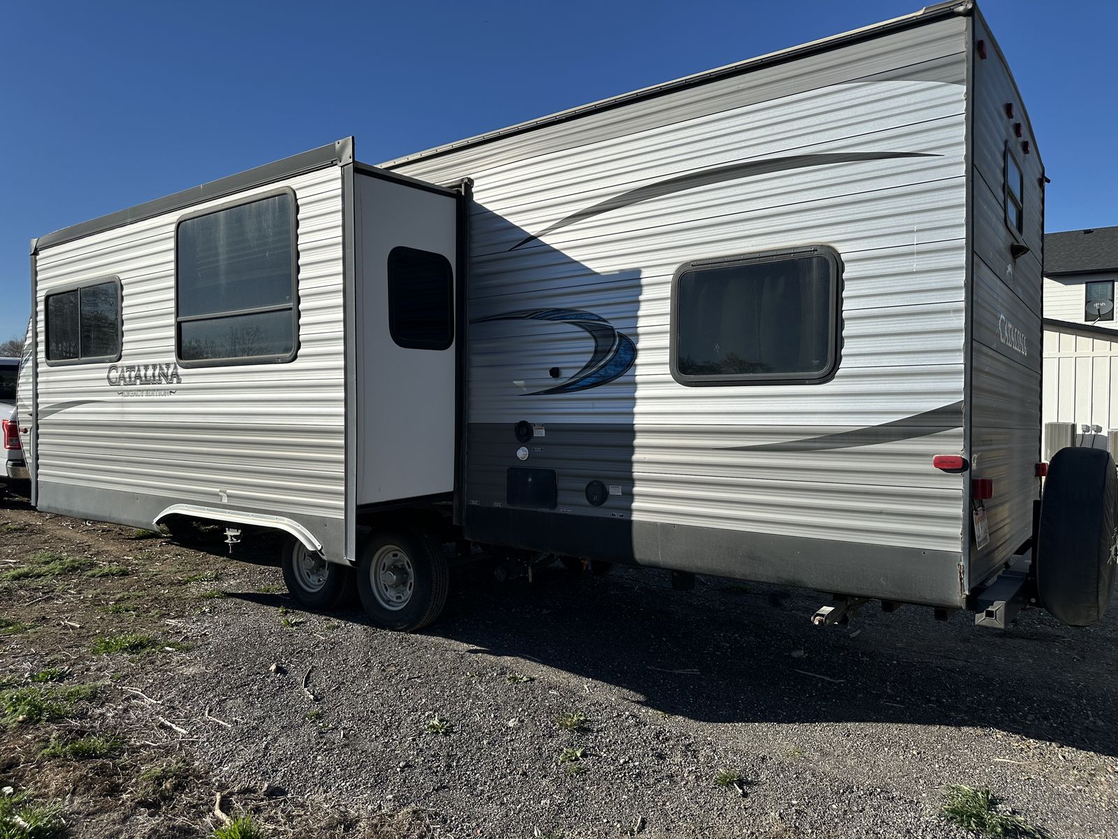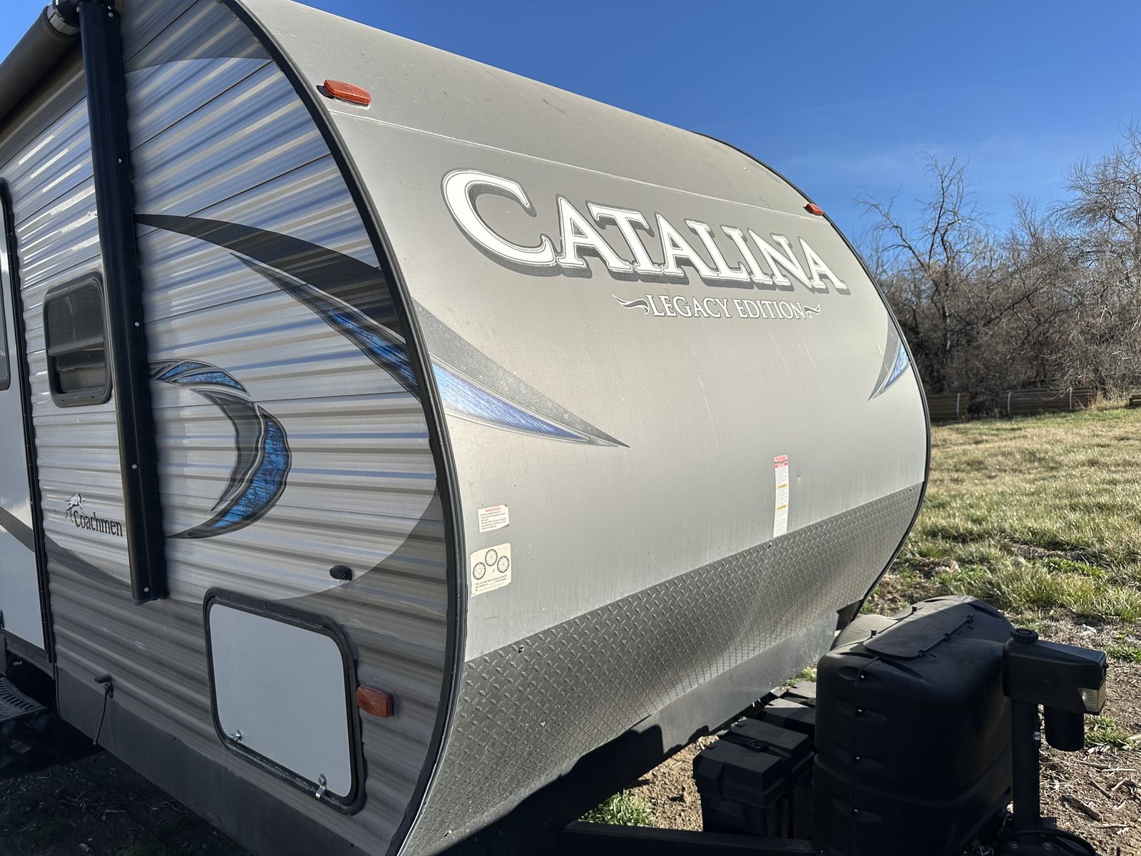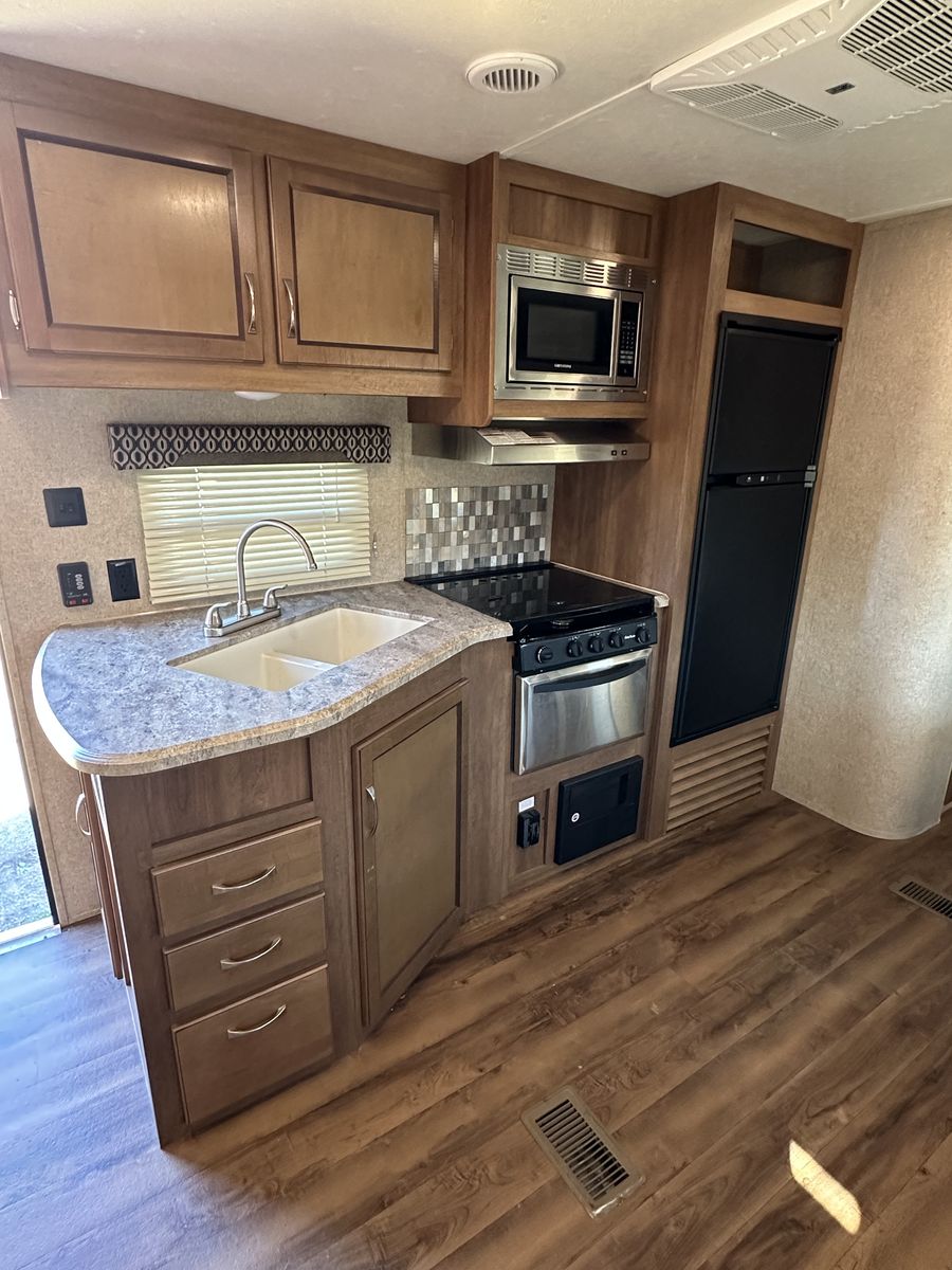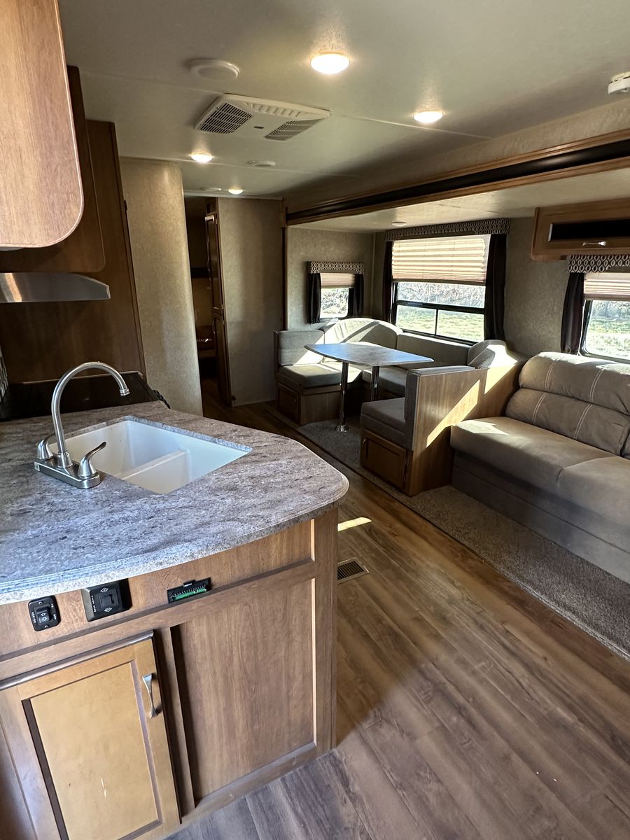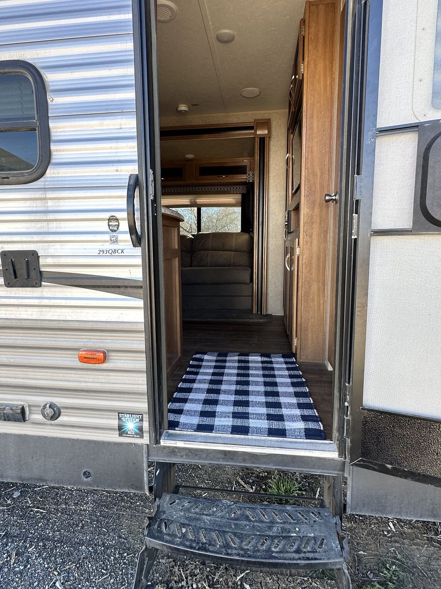 Spacious and family-friendly 2019 Coachmen Catalina 293QBCK travel trailer in great condition. This 33-foot bunkhouse floorplan and features a private bunk room, large U-shaped dinette, queen bed, and a roomy slide-out for extra living space. The trailer also includes an outdoor camp kitchen, large awning, and plenty of storage for trips with family or friends. Dry weight is around 7,200 lbs and overall length is about 33’8”, making it towable with many half-ton trucks.