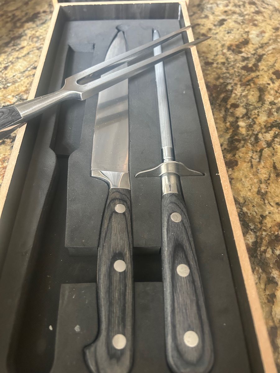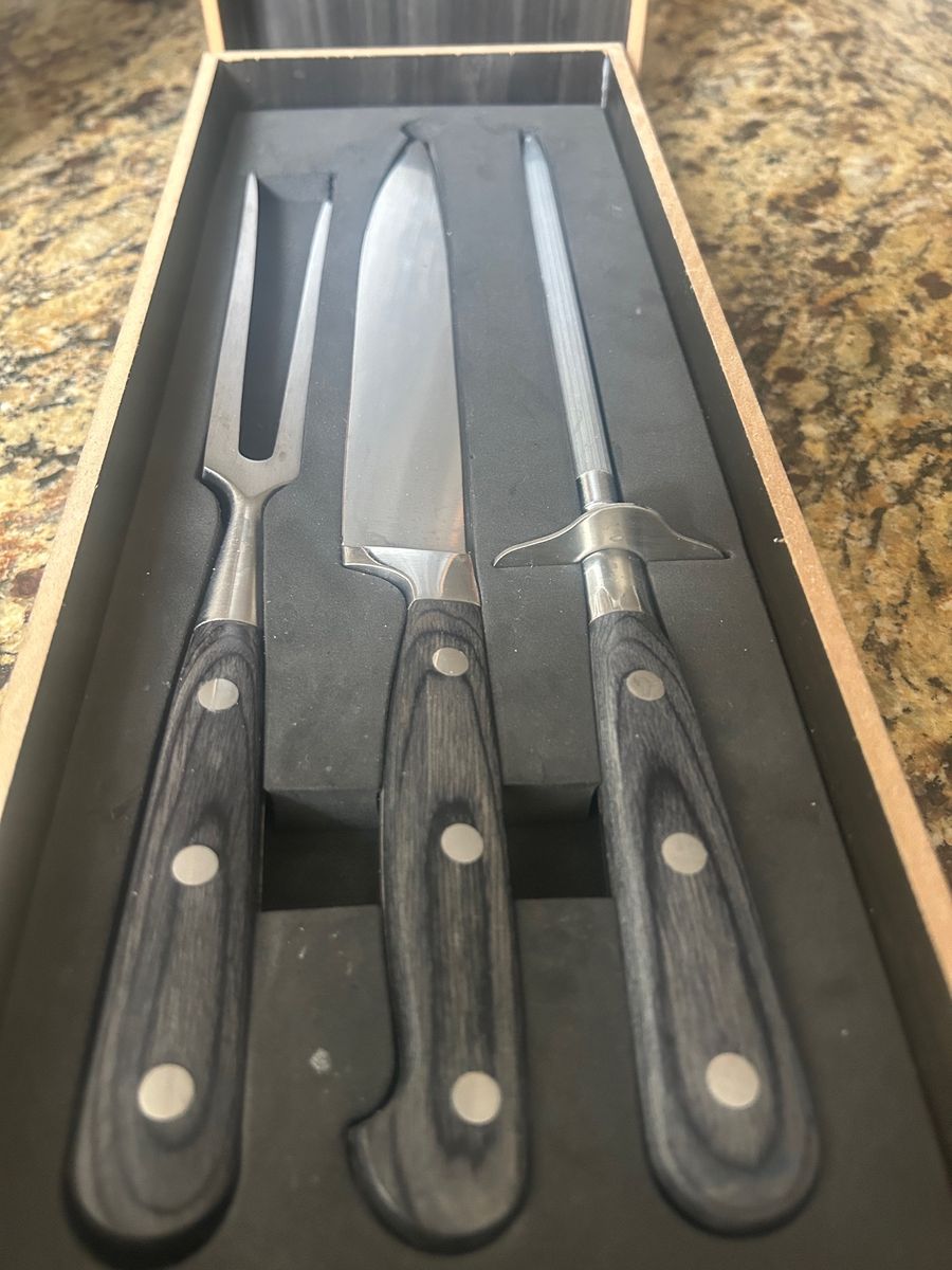 New meat carving set with beautiful black handles. Set in gift box. A nice gift for yourself or a friend or family member. Includes carving fork, chef's knife, and sharpening steel.
