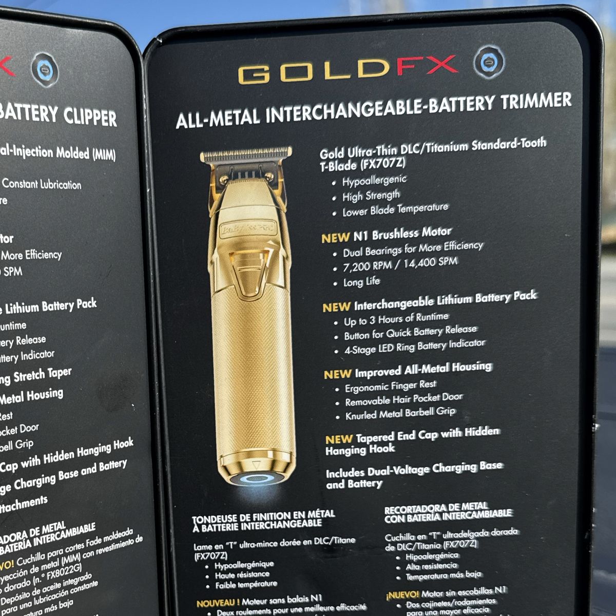 Gold Ultra-Thin DLC/Titanium Standard-Tooth T-Blade (FX707Z) Hypoallergenic High Strength Lower blade temperature New N1 Brushless Motor Dual bearings for more efficiency 7,200 RPM/14, 400 SPM Long-life New Interchangeable Lithium Battery Pack Up to 3 hours of runtime Button for Quick Battery Release 4-Stage LED Ring Battery Indicator New Improved All-Metal Housing Ergonomic finger rest Removable hair pocket door Knurled metal barbell grip Tapered End Cap with Hidden Hanging Hook