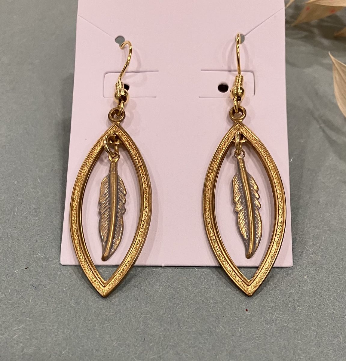Venmo1.5 inch long brass dangle earrings, accented with brass feathers. Ear wires are gold plated. Gift box included. Local meetup or can mail with ship fee.