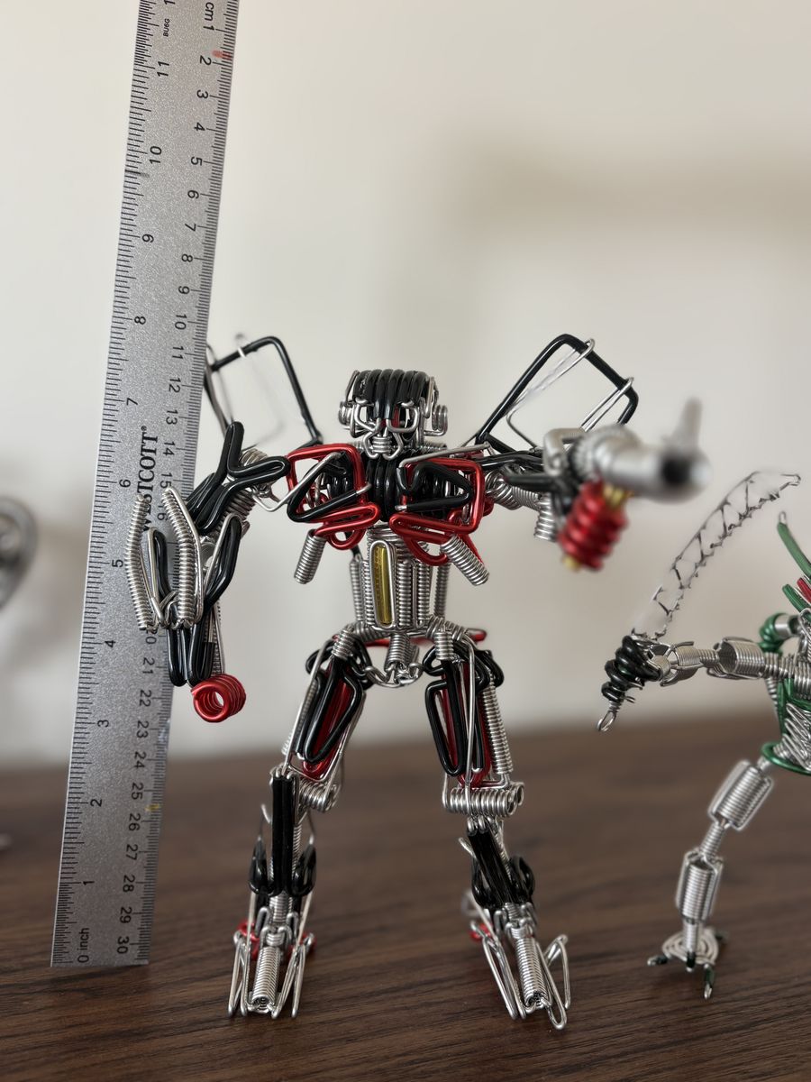 My 10 year old son is selling his huge collection of wire action figures (pics are just a sampling…. There are lots more). There are three sizes … one pic shown has the ruler next to one of the largest size. All the sizes have a variety of styles and are all very different and cool. Large size $13, Medium $10 and small $5.