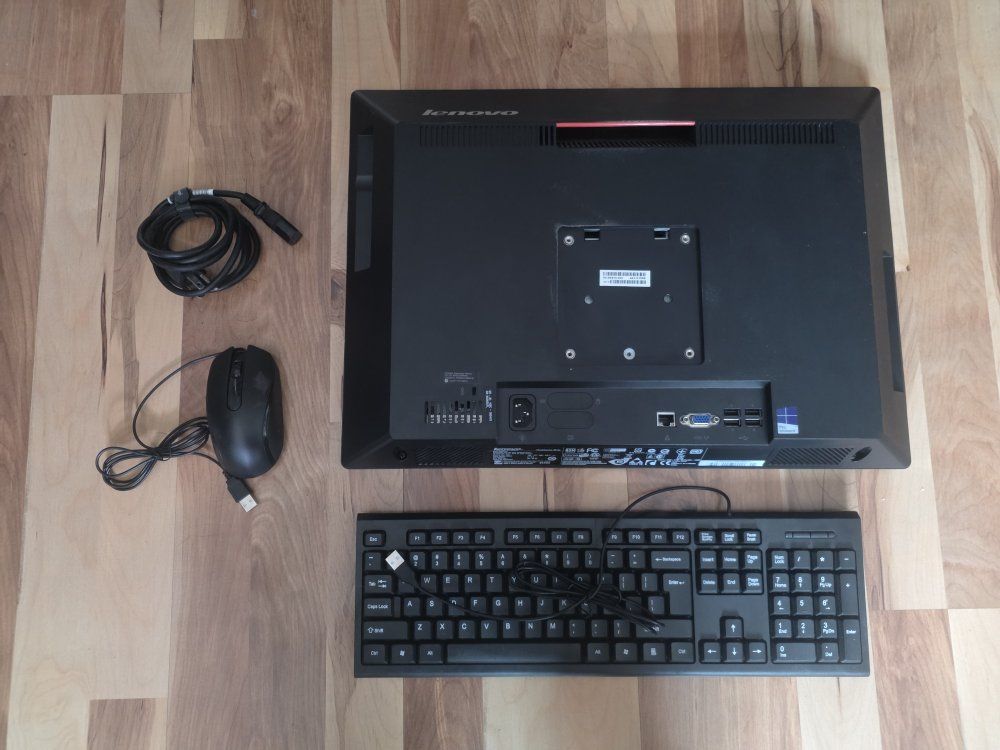 Comes with mouse, keyboard, and power cable. No stand, is compatible with any VESA stand.