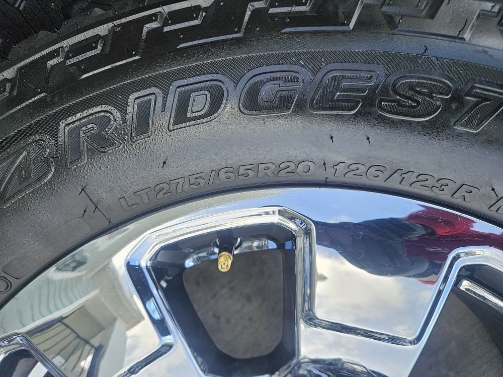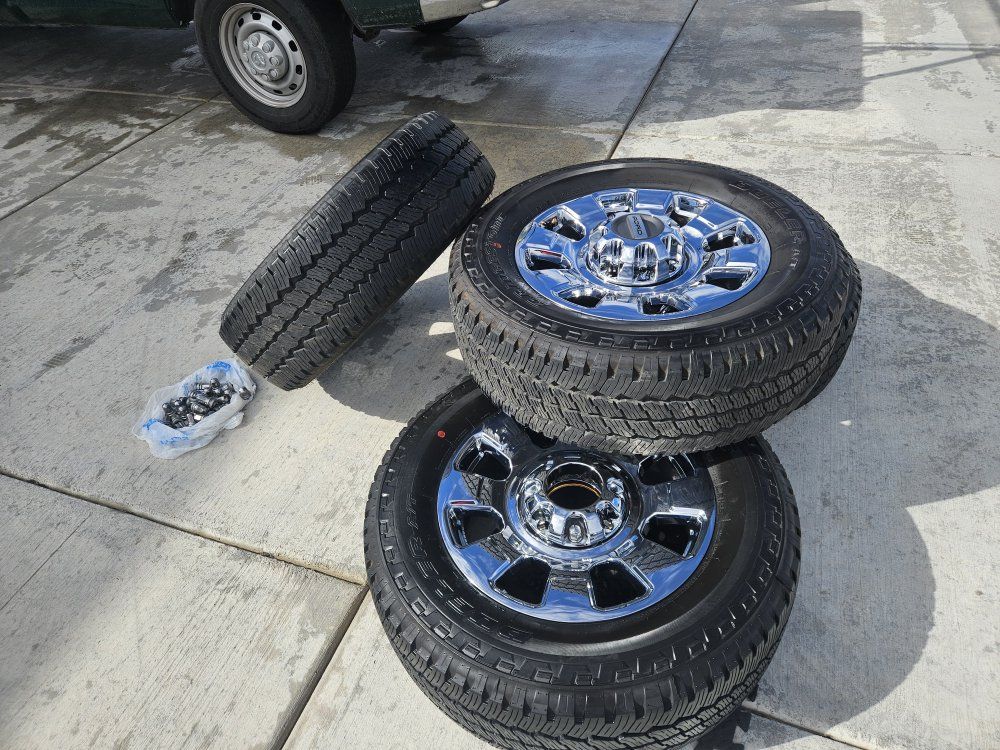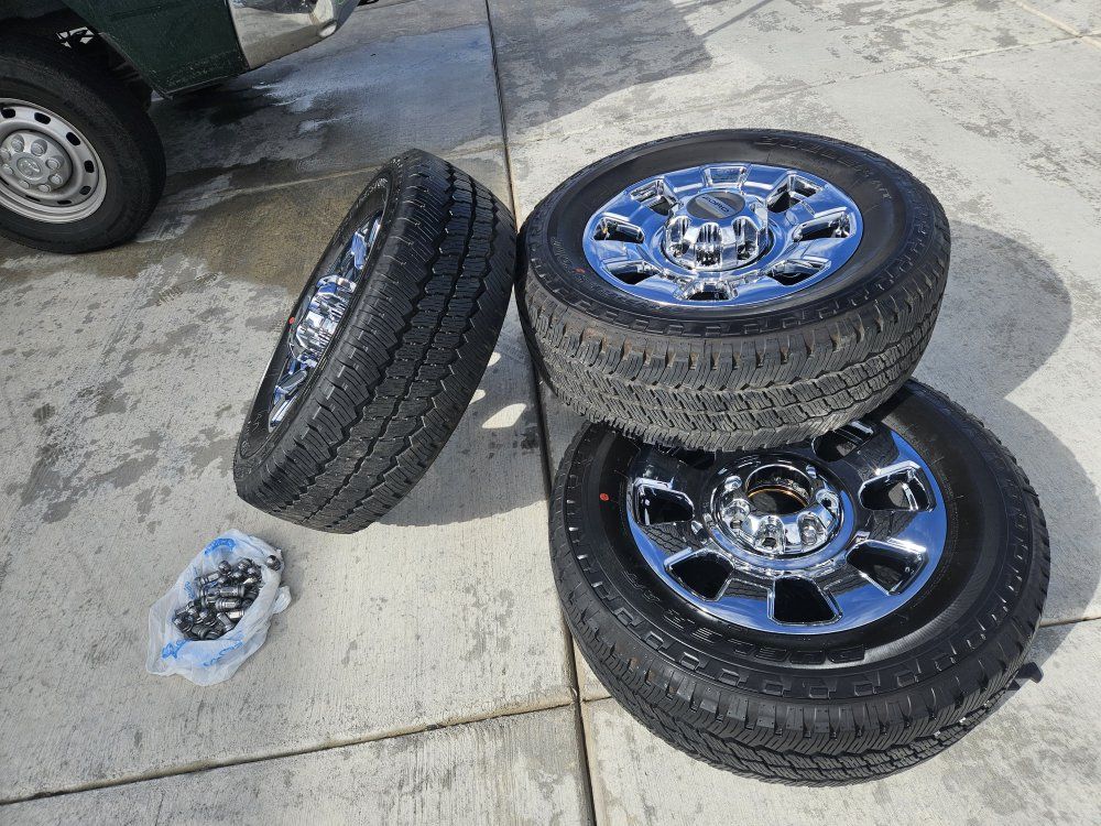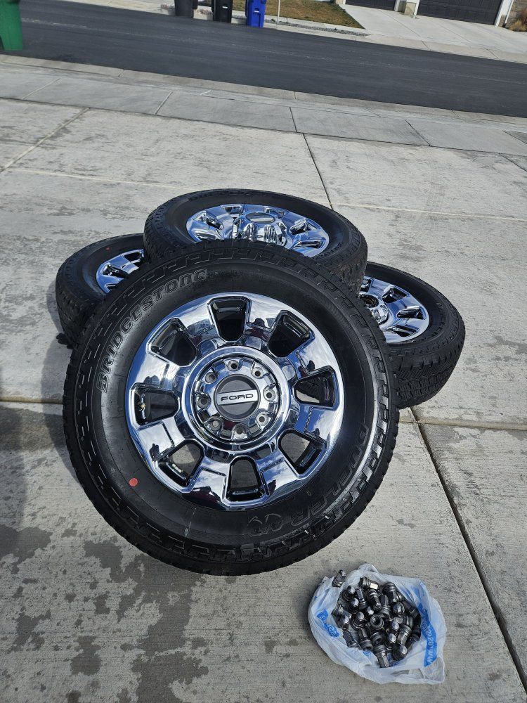 New 2026 Ford F350 Super Duty Lariat with chrome appearance package. Premium chrome PVD aluminum, 20 inch OEM Wheels Tires Bridgestone Dueler A/T RH-S LT275/65R20,only 10 miles on them coming with lugs nuts and center caps $1450 cash or venmo call or t3x 385 495 1119