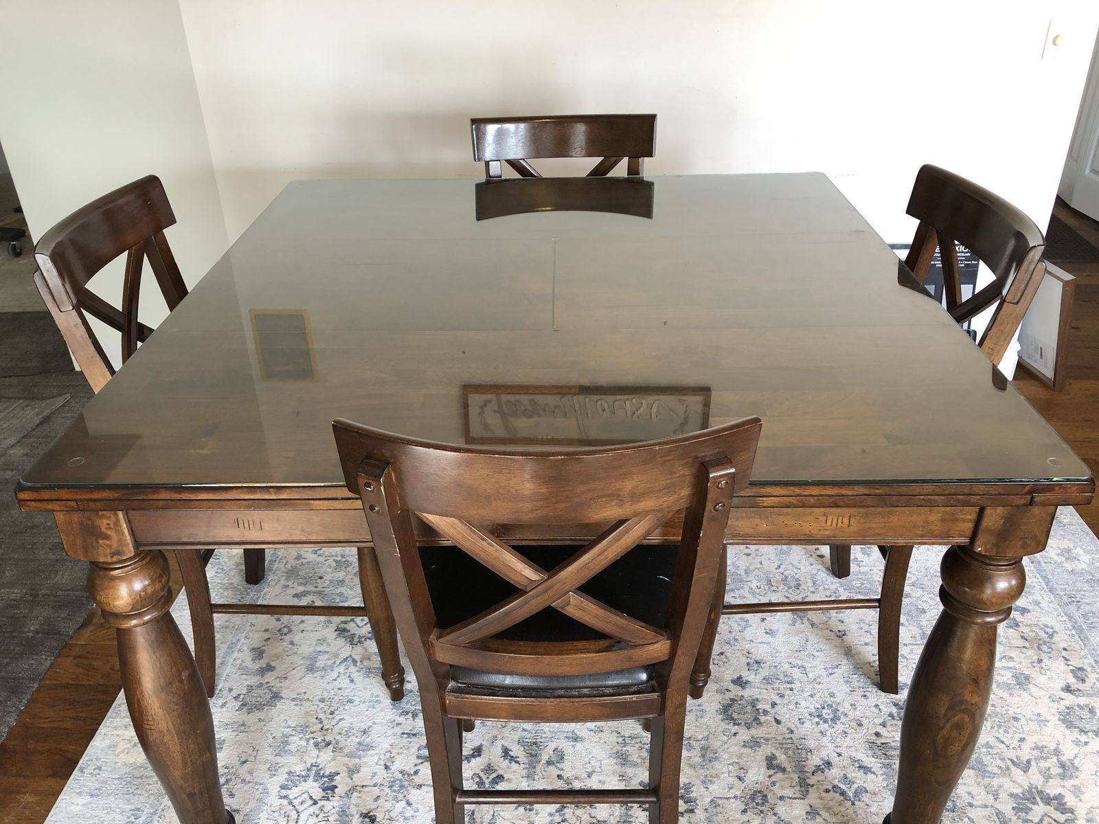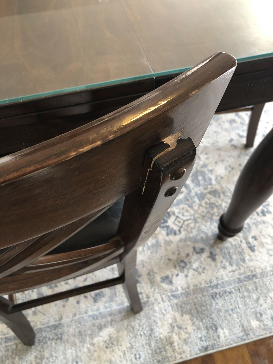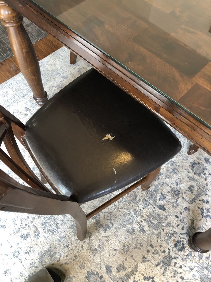 Really nice kitchen table with 4 chairs. I had a glass top made for it when it was new so the top of the table is perfect. There is a small tear in one of the chairs and a few small dings here and there but it’s still in pretty good shape. This table came from fishers home furnishings new cost was like $1,500 bucks.
