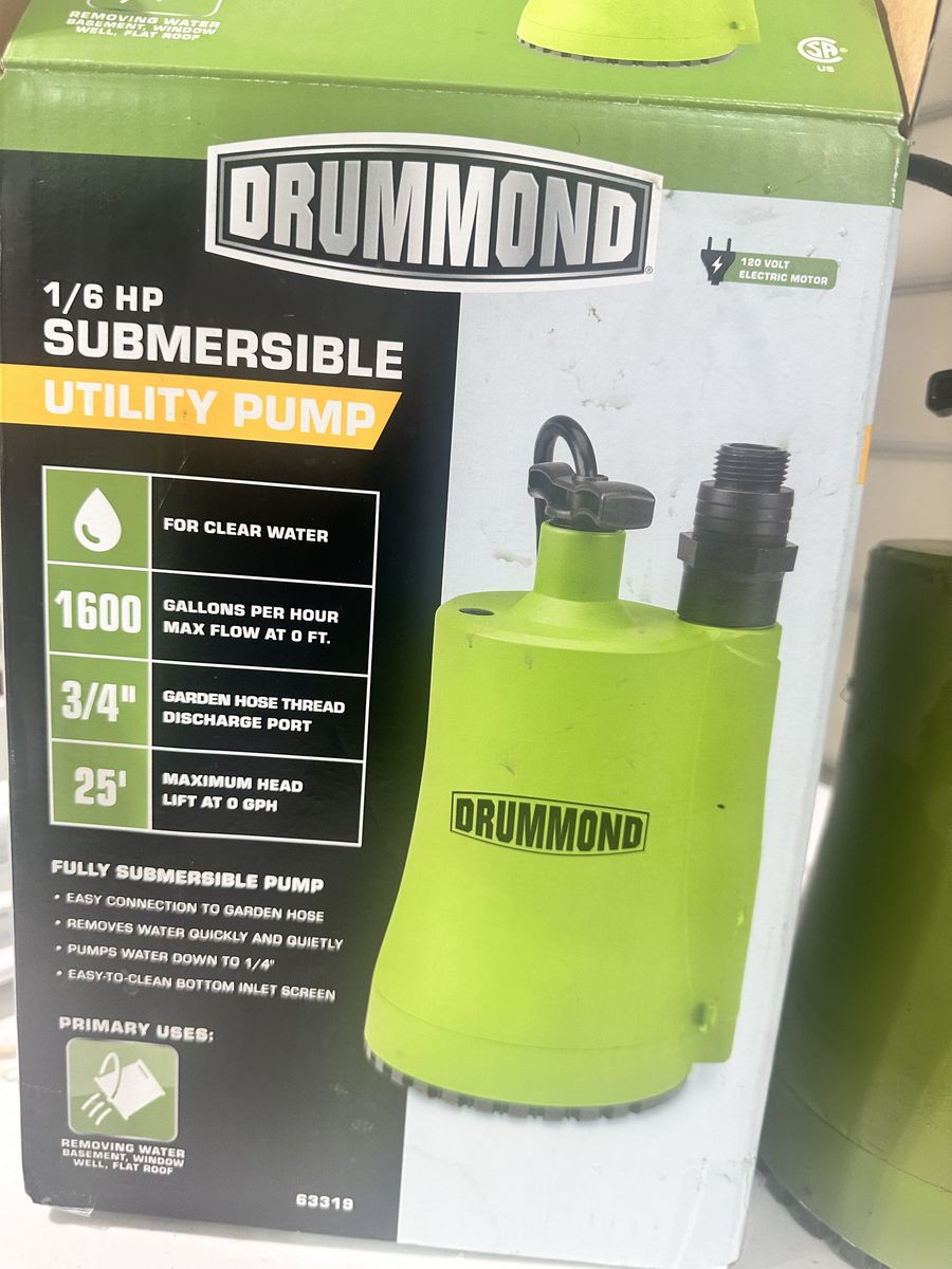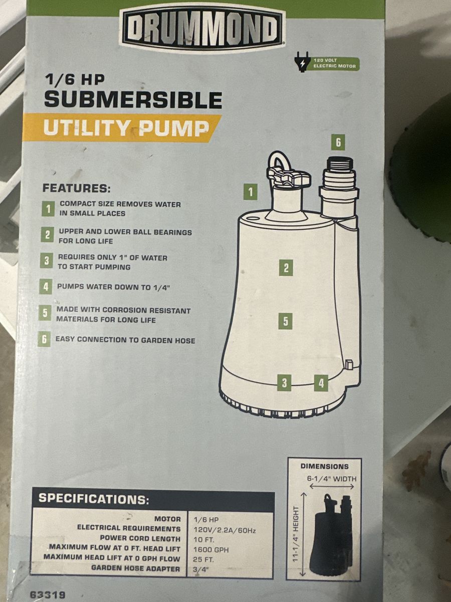 Venmo1-6 HP 1600 gallons per hour sump pump. Never used. It was purchased from Harbor Freight ($73) and then didn’t fit in the sump pit where I needed to install it.
