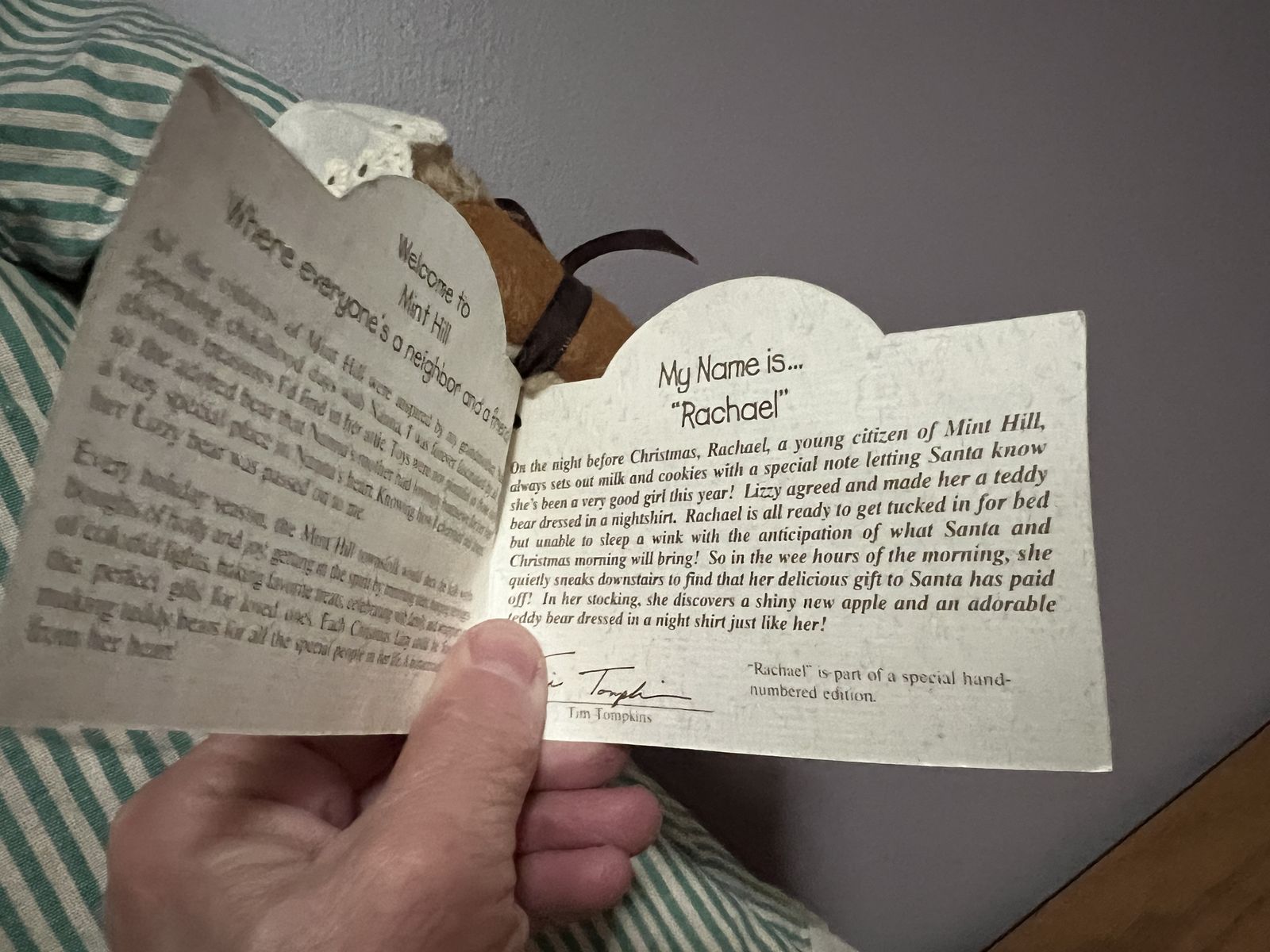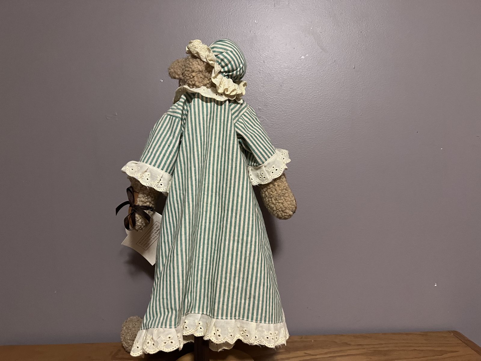 She comes dressed in a charming green striped nightgown and bonnet with lace trim and patch details. The bear still has the original Teddy Tompkins tag and story booklet attached.