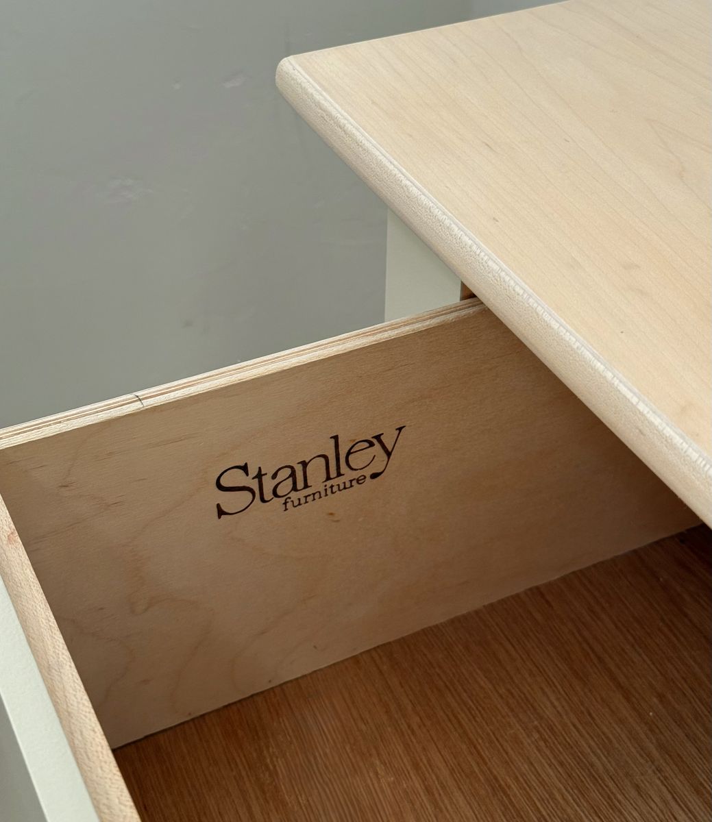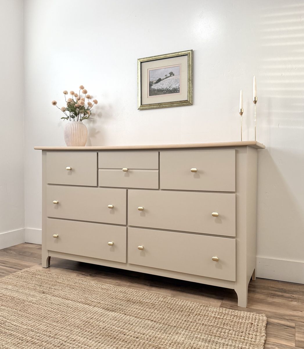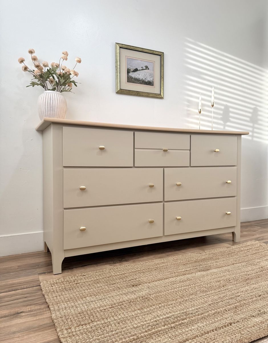 VenmoBeautiful seven drawer dresser crafted by Stanley. Solid maple wood, minus side panels. In a neutral tone with wood accents. All drawers are dovetail for durability. Paired with matte golden knobs. This quality piece is ready for a new home. Delivery available for a fee.