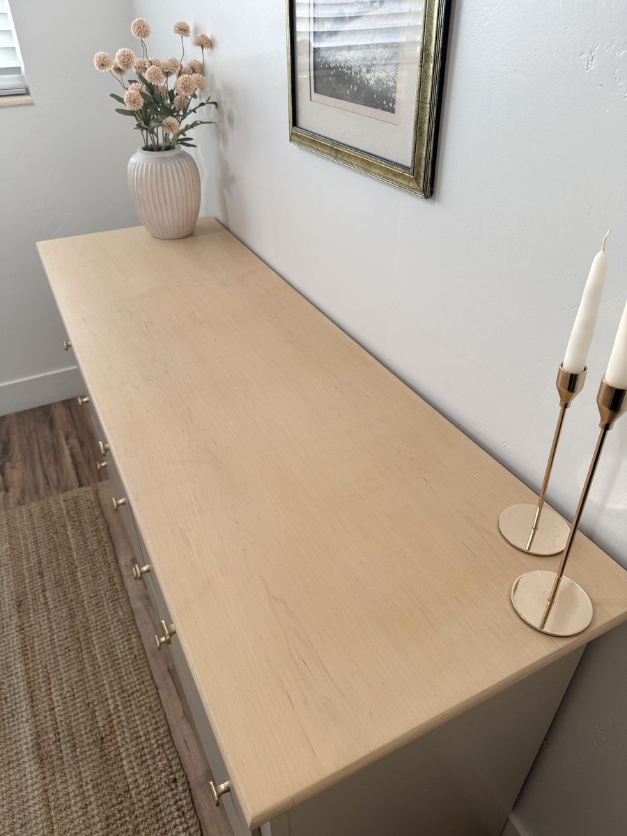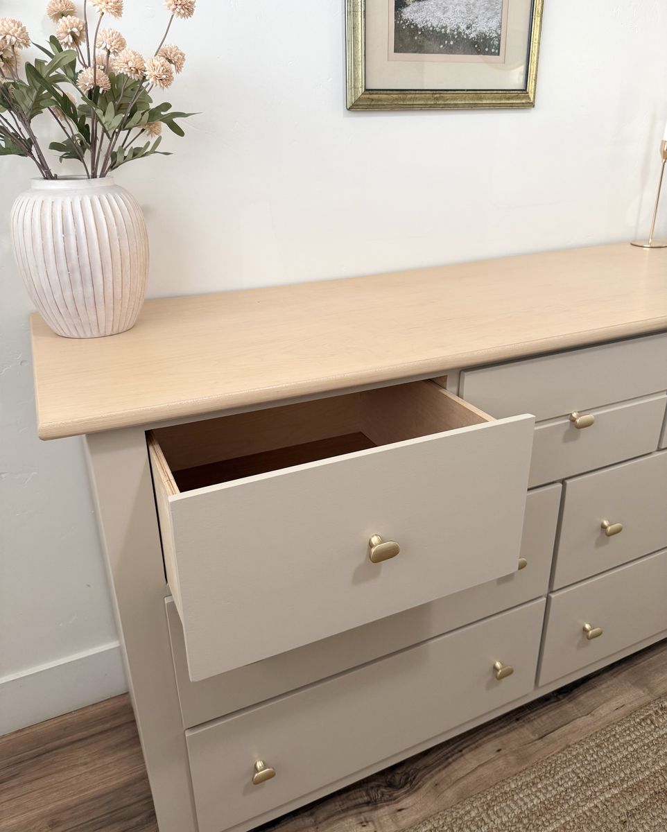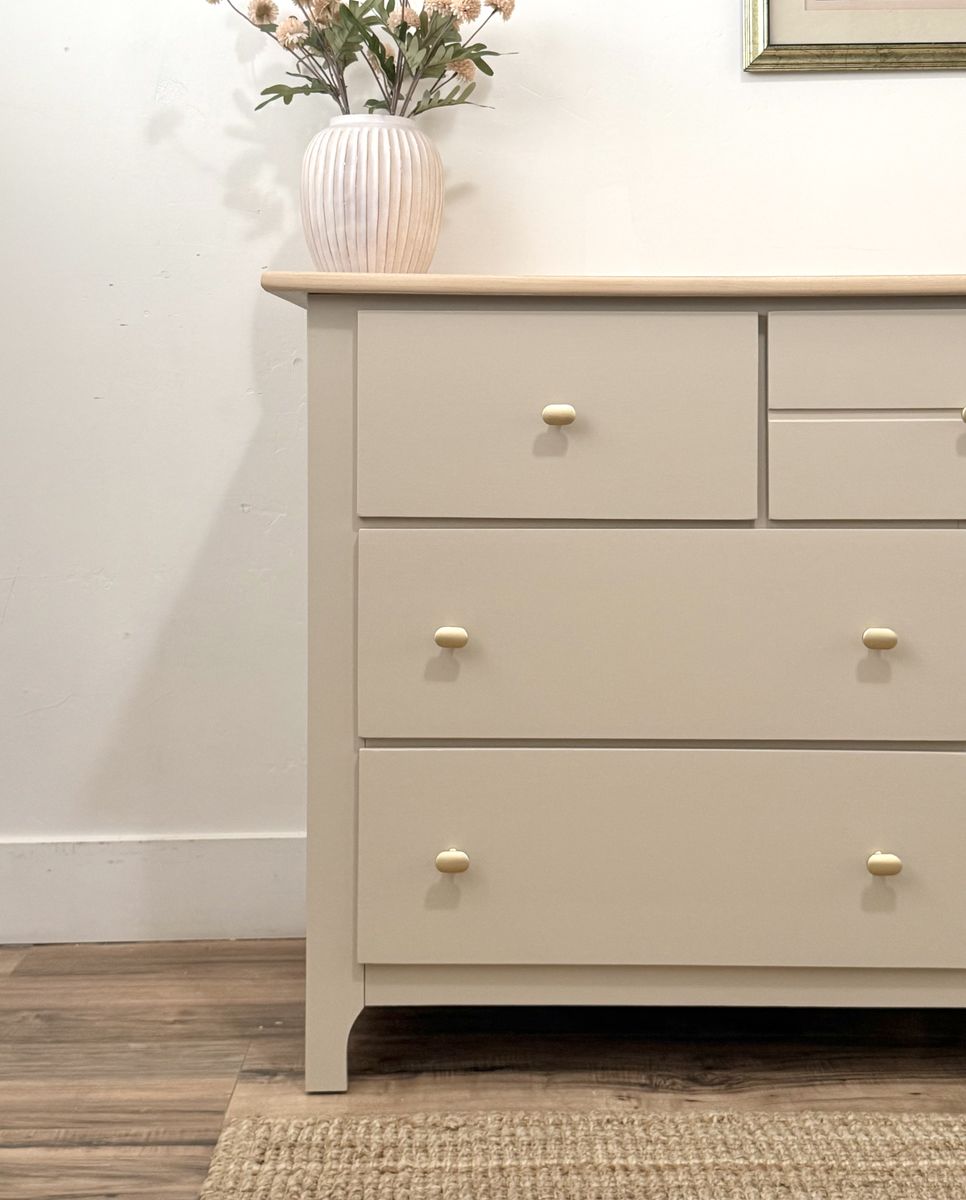 VenmoBeautiful seven drawer dresser crafted by Stanley. Solid maple wood, minus side panels. In a neutral tone with wood accents. All drawers are dovetail for durability. Paired with matte golden knobs. This quality piece is ready for a new home. Delivery available for a fee.