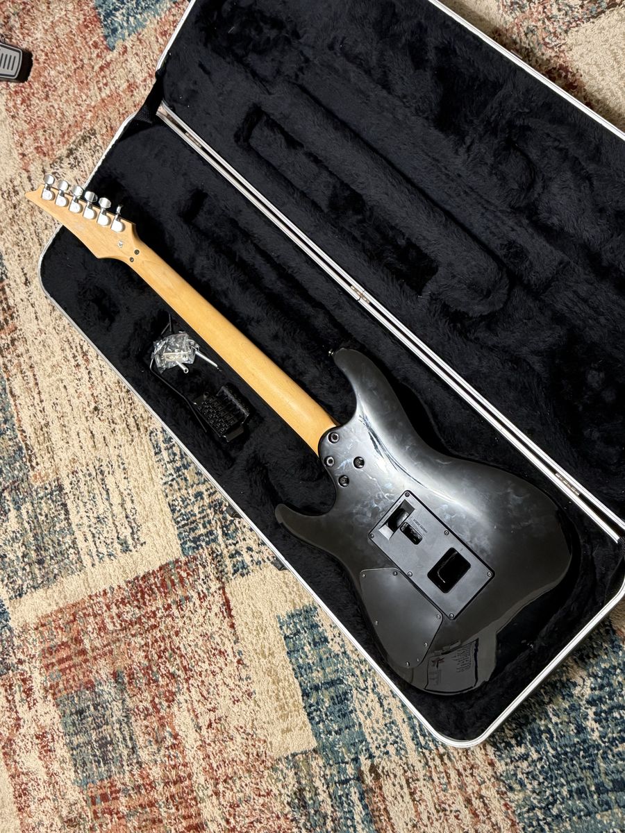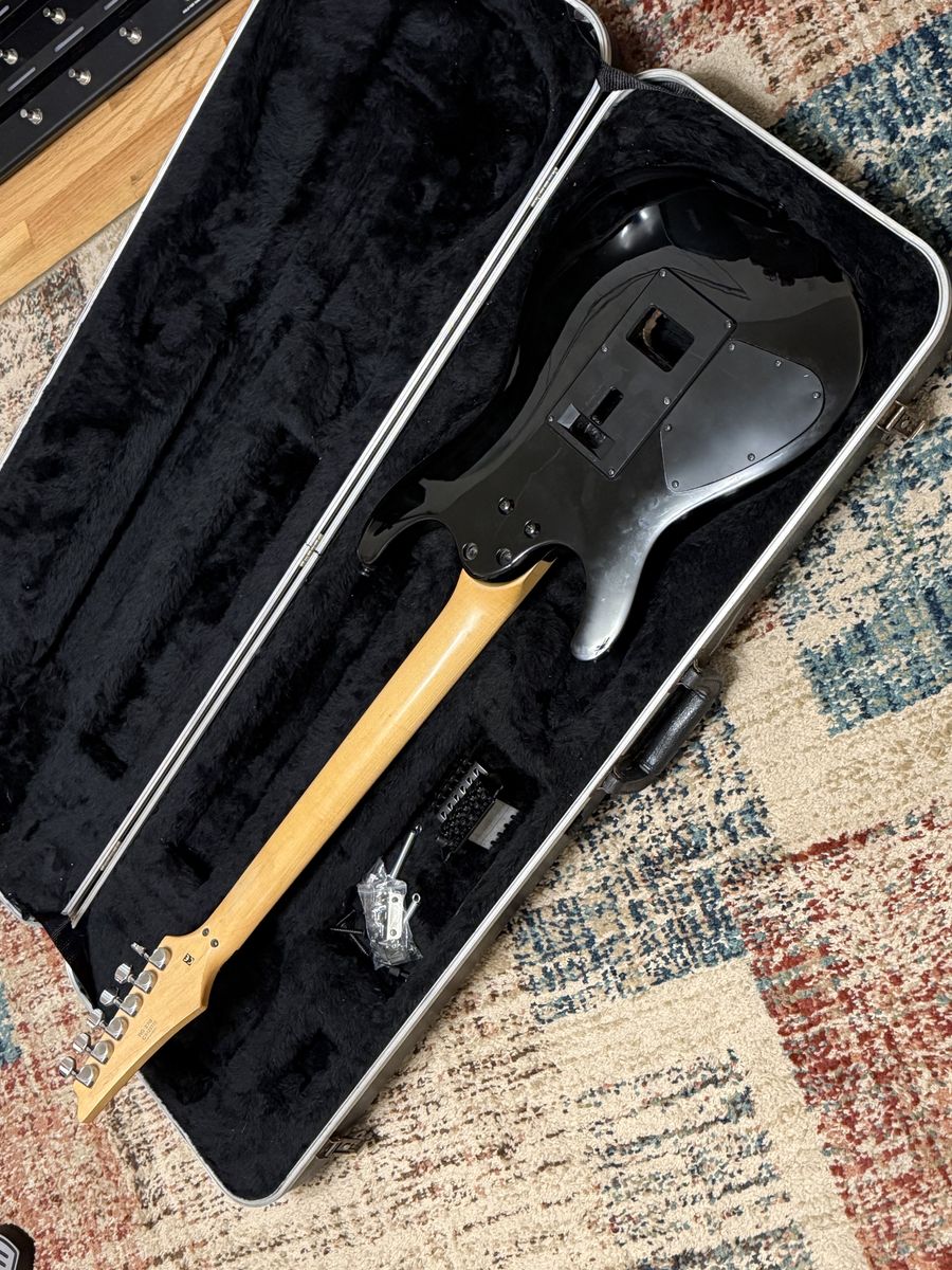 VenmoThe body is an S Series MIK from about 1996. Has original finish, pickups, pots, switch, and wiring. The neck is off a similar era RG and has its original tuners. Neck joint fits great, comes with screws as well. I have a tremolo bridge for it as well as the hardware to mount it, uninstalled. The case is rough but clean and works great.