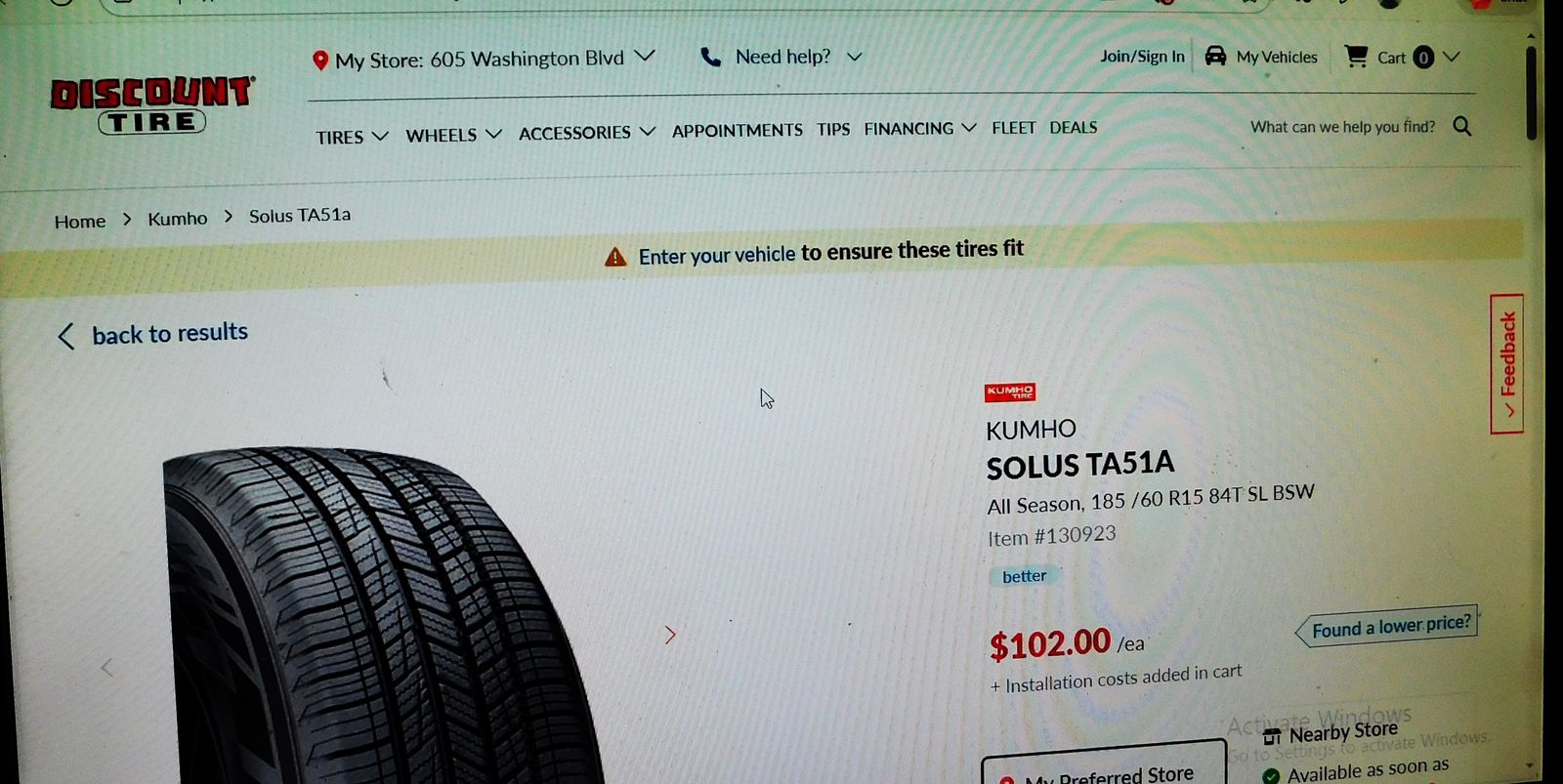 Set of 4 185 60R 15 Kumho Solus AT51a A/S 84T all season good shape like new $180 $45 per tire Discount Tire $102 per tire