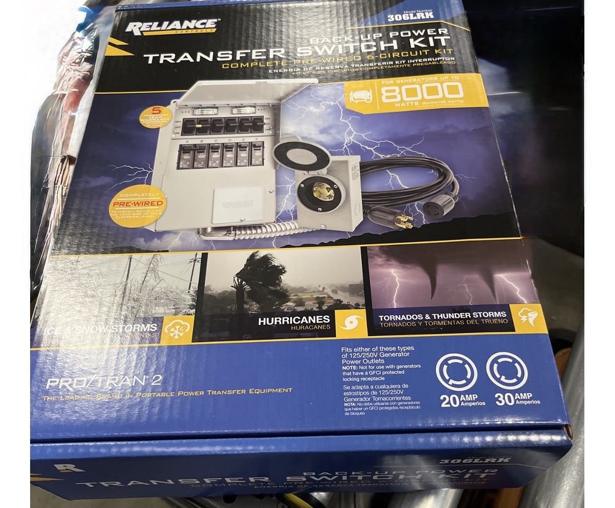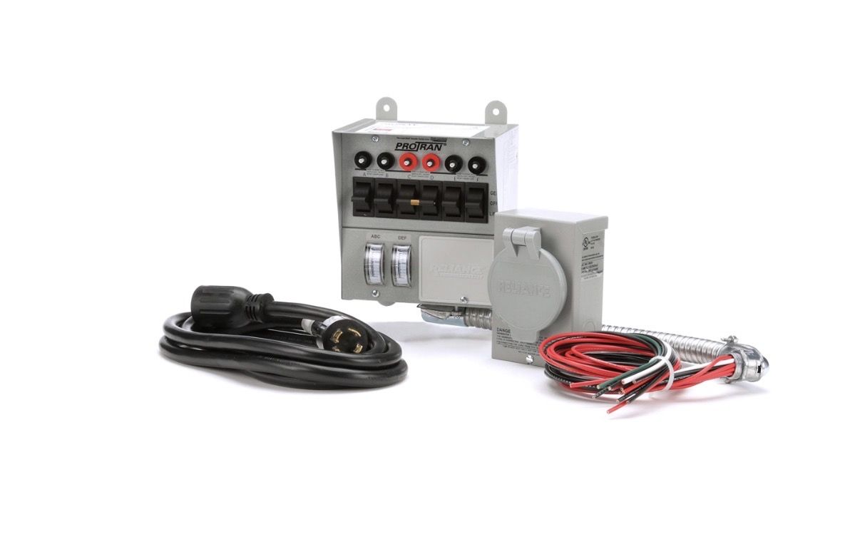 Product Description The Reliance Controls 31406CRK 30 Amp 6-Circuit Pro/Tran Transfer Switch Kit has everything you need to easily complete a portable generator transfer switch installation in a home or office. The purpose of a transfer switch is to connect a secondary power source, like your very own portable generator, to circuits in your home or building that are wired into the electrical system. Thus, it is designed to enable the wiring system of the building to accept the full power of a portable generator, which can run multiple electrical appliances and devices during a power outage. The transfer switch ensures that you can safely use back up power during a power outage without having to worry about back feeding the utility line. In an emergency situation, this kit can make all the difference. Since 1909, Reliance Controls Corporation has contributed more innovations than any other single manufacturer and has been awarded over 85 patents on manual transfer switches, time switches and accessories. Reliance Controls Corporation specializes in the manufacturing of a wide variety of electrical products. The primary product line consists of heavy duty time clocks and controls, generator accessories, transfer switches and transfer panels for portable generators. And after over a century of innovation, Reliance Controls Corporation has built an enviable reputation for high quality, superior engineering and exceptional customer service. Amazon.com The Reliance Controls Corporation 6-circuit 30 Amp transfer switch is a complete turn-key kit with everything needed to make a professional transfer switch installation in a home or office. It is designed to enable the wiring system of the building to accept the full power of a portable generator, which can run multiple electrical appliances and devices during a power outage. Use this transfer switch for up to 7,500-watt generators equipped with NEMA L14-20 or L14-30 power outlets. The kit includes a 30A 6-circuit prewired loadside reliance transfer switch with wattmeters; 30 Amp outdoor power cord inlet box, a 30 Amp 10-foot generator power cord with L14-30 ends, and an extra L14-20 cord end for smaller generators