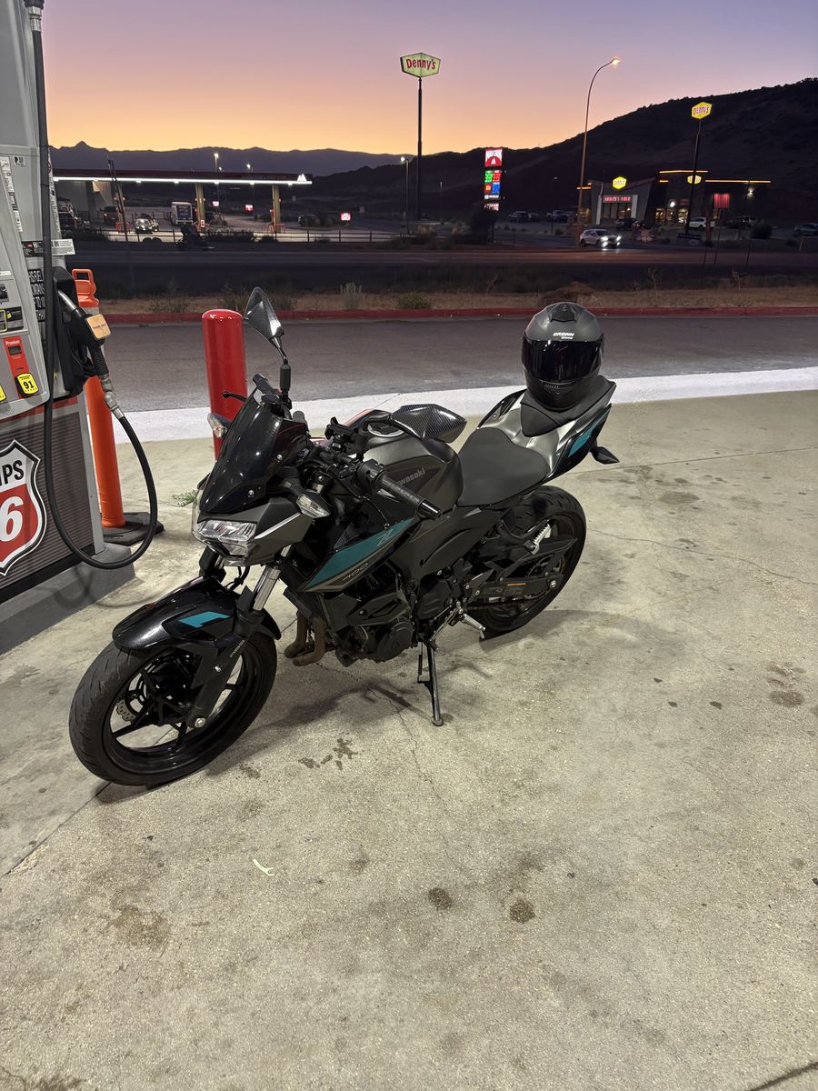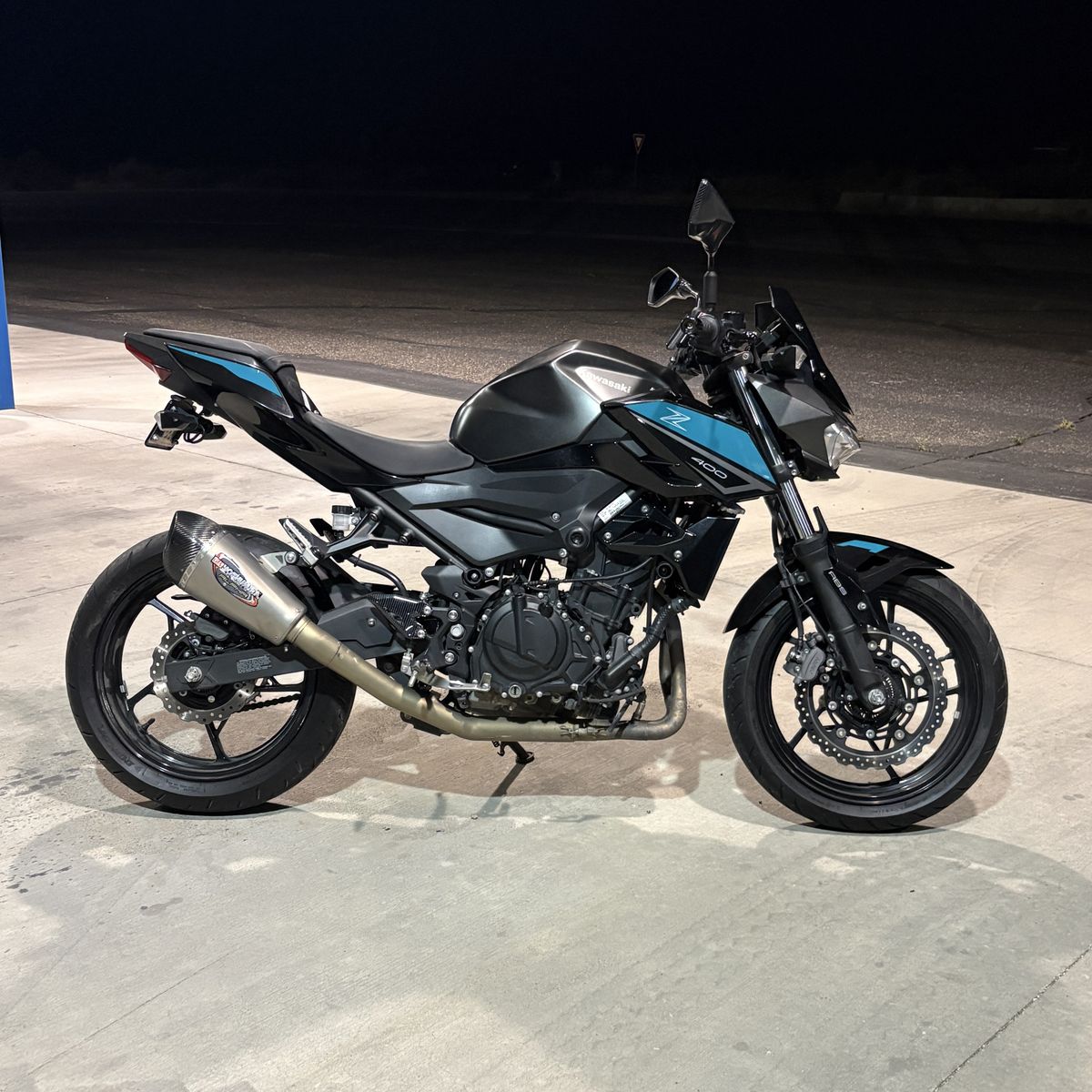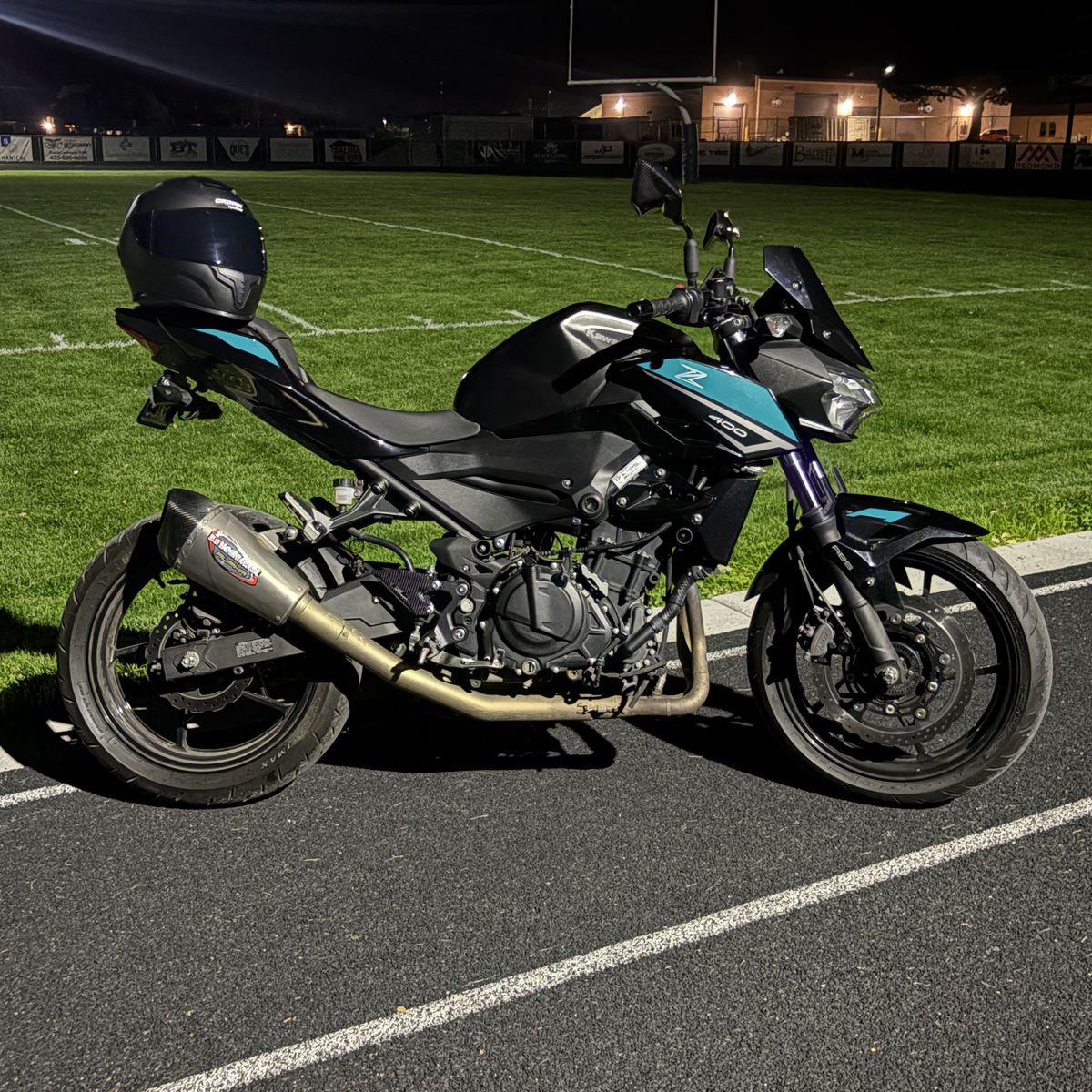 PayPal2023 Kawasaki Z400, Black, grey, blue. 3,400 miles. Cleaned after every ride, never been beat on. 2 owners. Mirrors and chain guards wrapped in carbon fiber for a clean look. fun little bike for someone to start on or just a great bike in general.