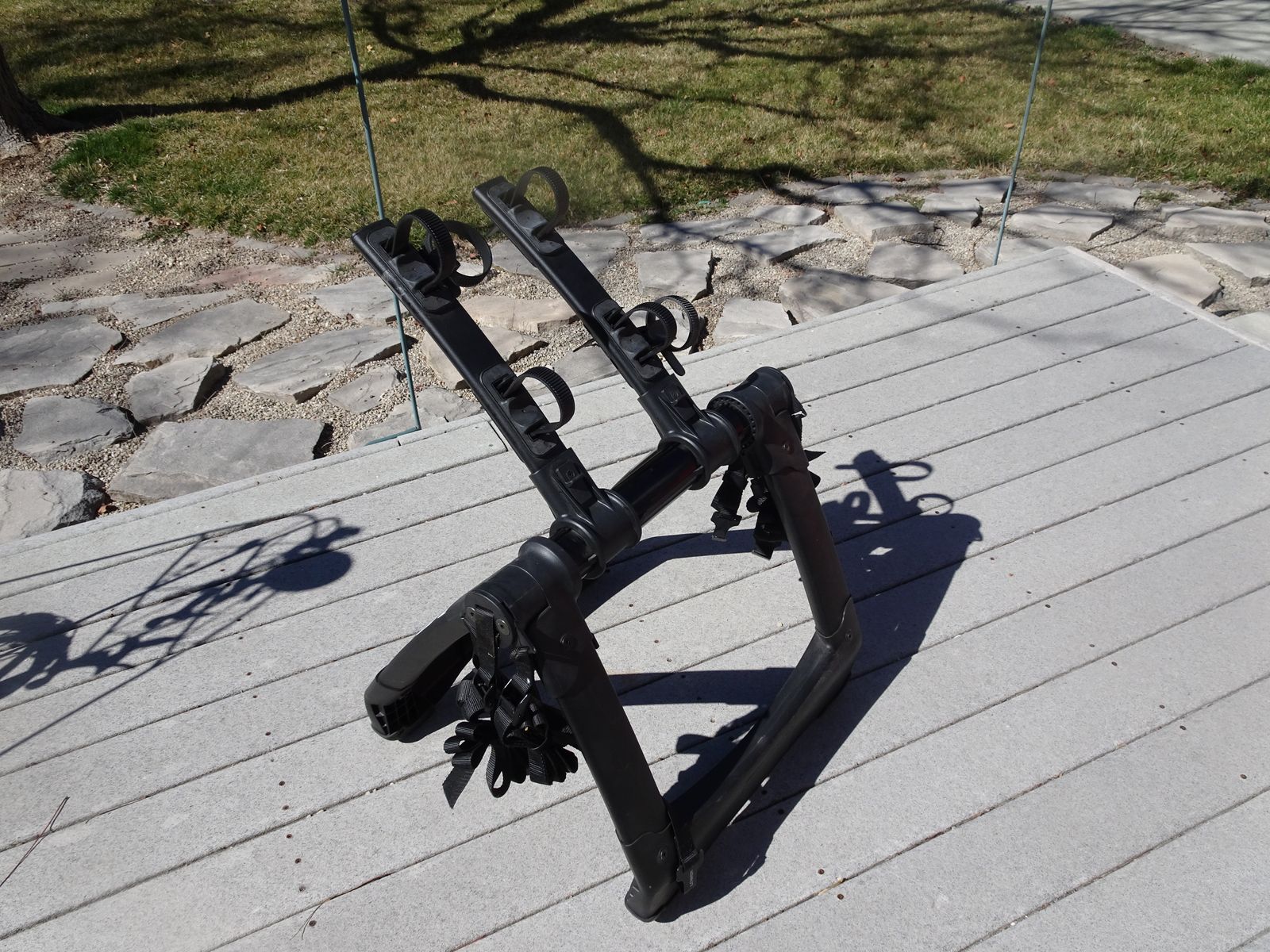 Kuat Highline Trunk Rack. Supports 2 bicycles. It is light and strong with an anti-sway strap system. Maximum weight per bicycle is 30 lbs thus 60 lbs total capacity. The trac weighs 15 lbs unloaded.