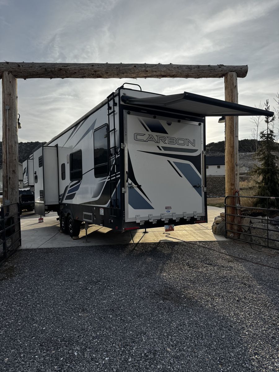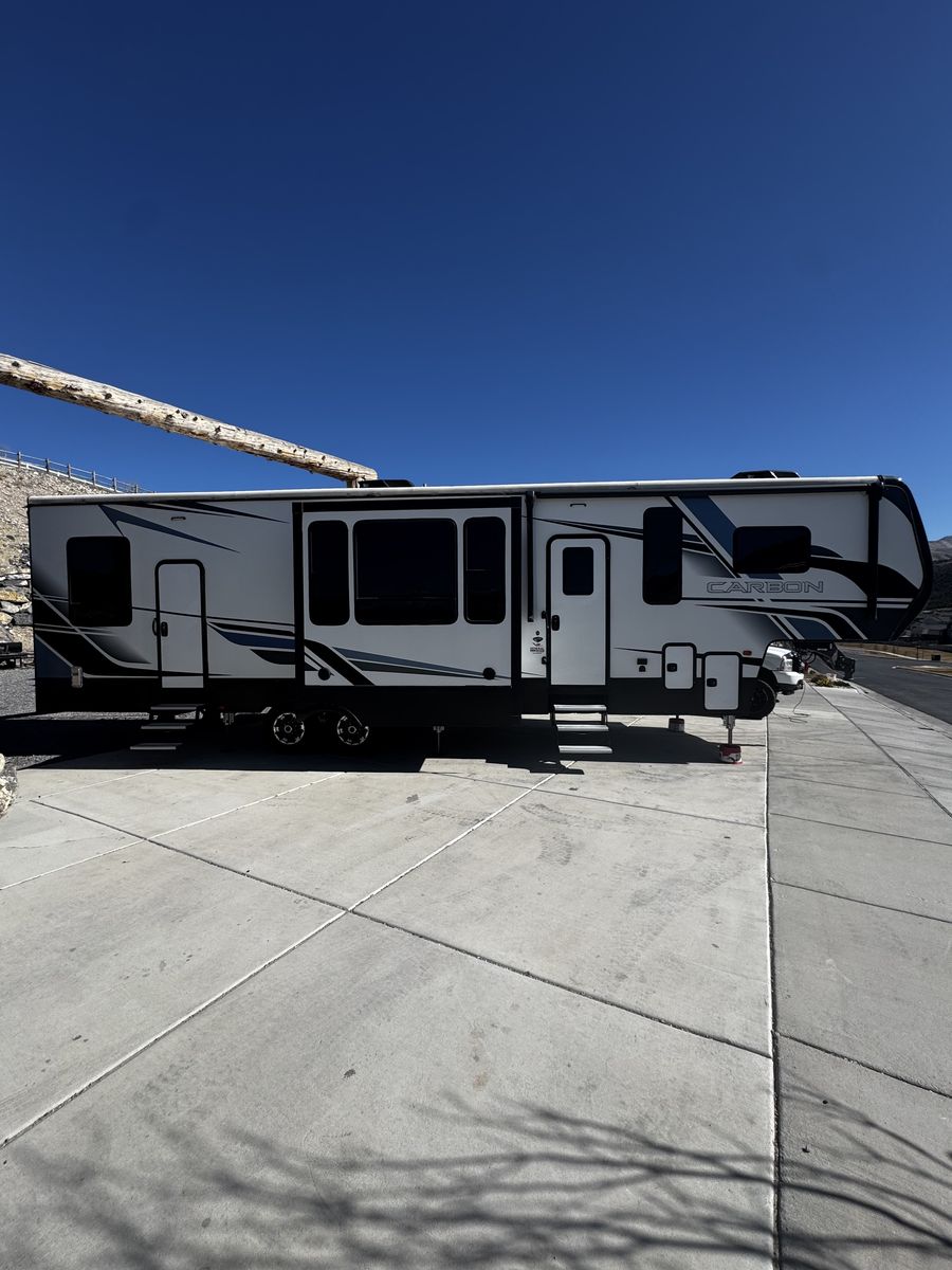 ApplePay2021 Carbon 348 dual axel 5th wheel toyhauler. Has everything you need and more. Sleeps 8 in beds, kings sized master bed, has 3 slides, 94 gal fresh tank, 30 gal fuel tank for onboard generator and exterior fuel station for toys. Dry weight is 12,500lbs, 39’11” in length. Comes with a Cornerstone warranty that has 1.5 years remaining that covers everything on the trailer.