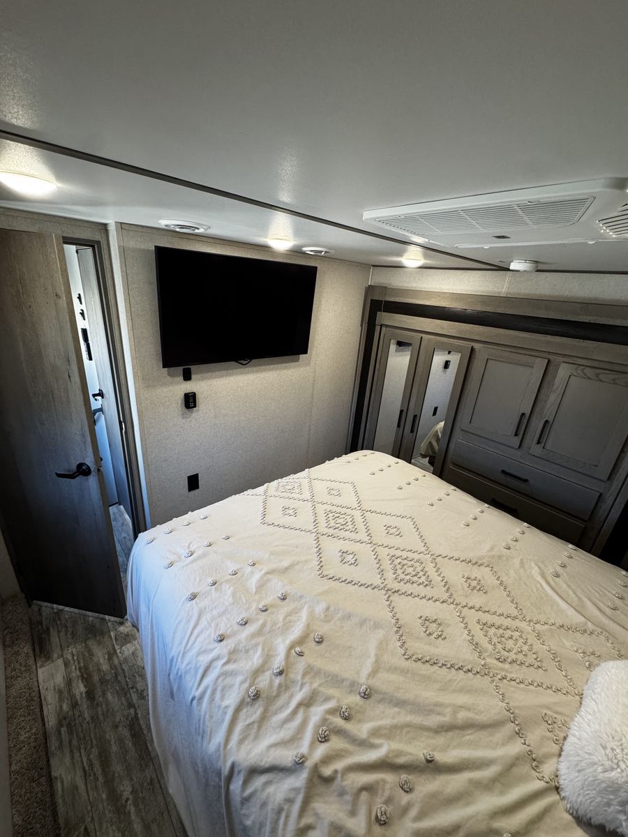 KEY FEATURES: *$54,000 obo *extreme weather package (camp year round) *6 point automatic hydraulic leveling jacks *13’ garage *2 AC units *2 solar panels *2 awnings (side and rear) *separate garage entry door *race doors and patio ramp enclosure *tankless water heater *exterior gas hook up for bbq *exterior wash station (can run a pressure washer from it) *interior/exterior sound system
