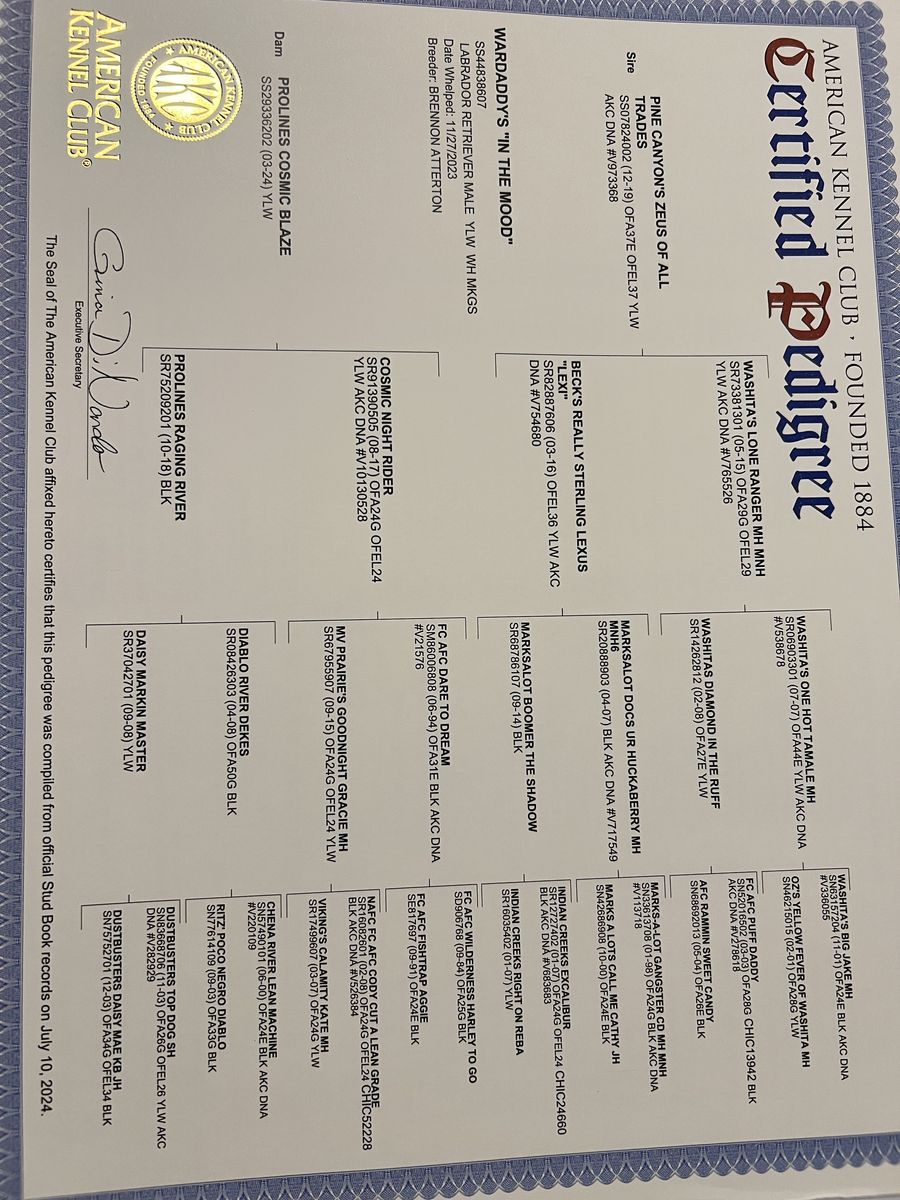 VenmoTank is the grandson of HRCH Washitas Lone Ranger MH MNH Tank is an awesome lab that has looks and pedigree. He is a solid 75lbs and can hunt all day long. He has a great on/off switch and loves to be with the family. If you're looking for a new blood line that has everything you've found the right dog Tank is an incredible dog that continues to impress us with his ability to learn, eagerness to please, and great companionship. He has passed down his drive as well as his manners.