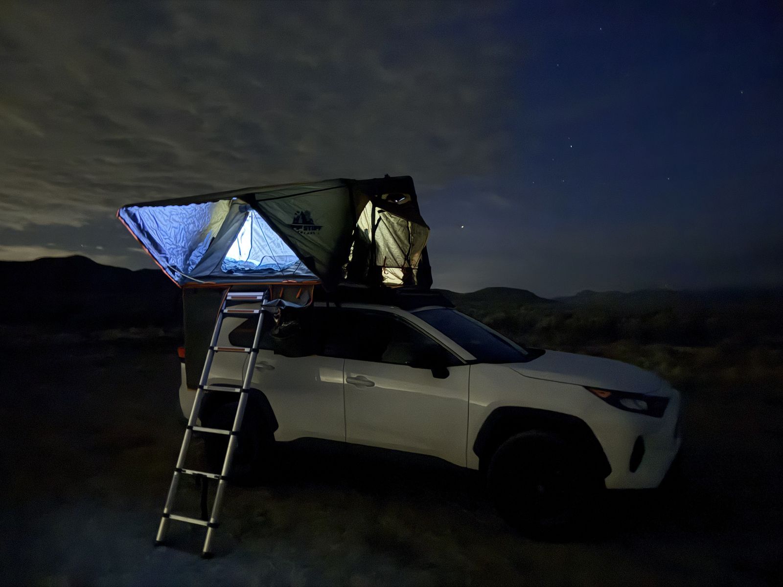 Alpha 2 Tent: • A hard-shell four-season tent with room for two people • Ultra-fast setup time takes less than two minutes • 53 x 78-inch mattress that is 2.36-inches thick •Manufactured from high-quality 280G poly-cotton windproof fabric •Heavy-duty YKK zippers with custom para-cord pull •Includes a 210D poly-oxford rainfly •Three windows with awnings and mesh screens for excellent ventilation and views •Built-in skylight for star gazing and additional light •Built-in internal and external LED light strips •Designed to open to the passenger side only •All aluminum frame, ladder, and roof rack mounts