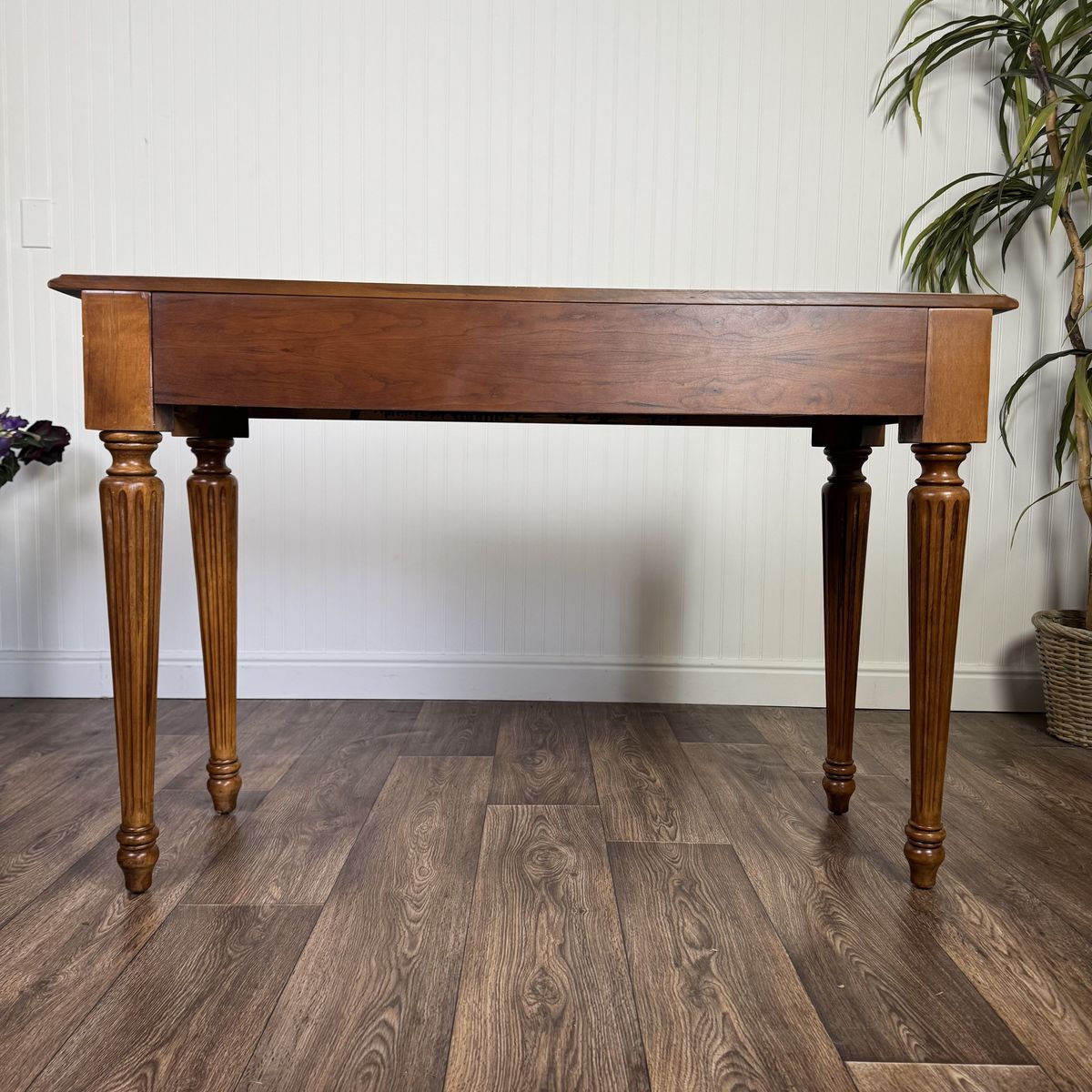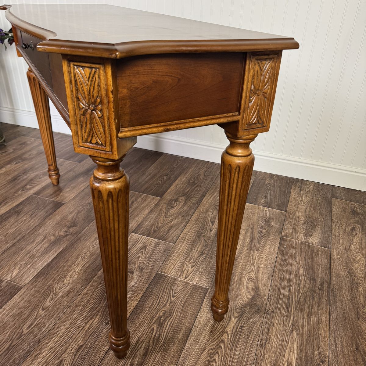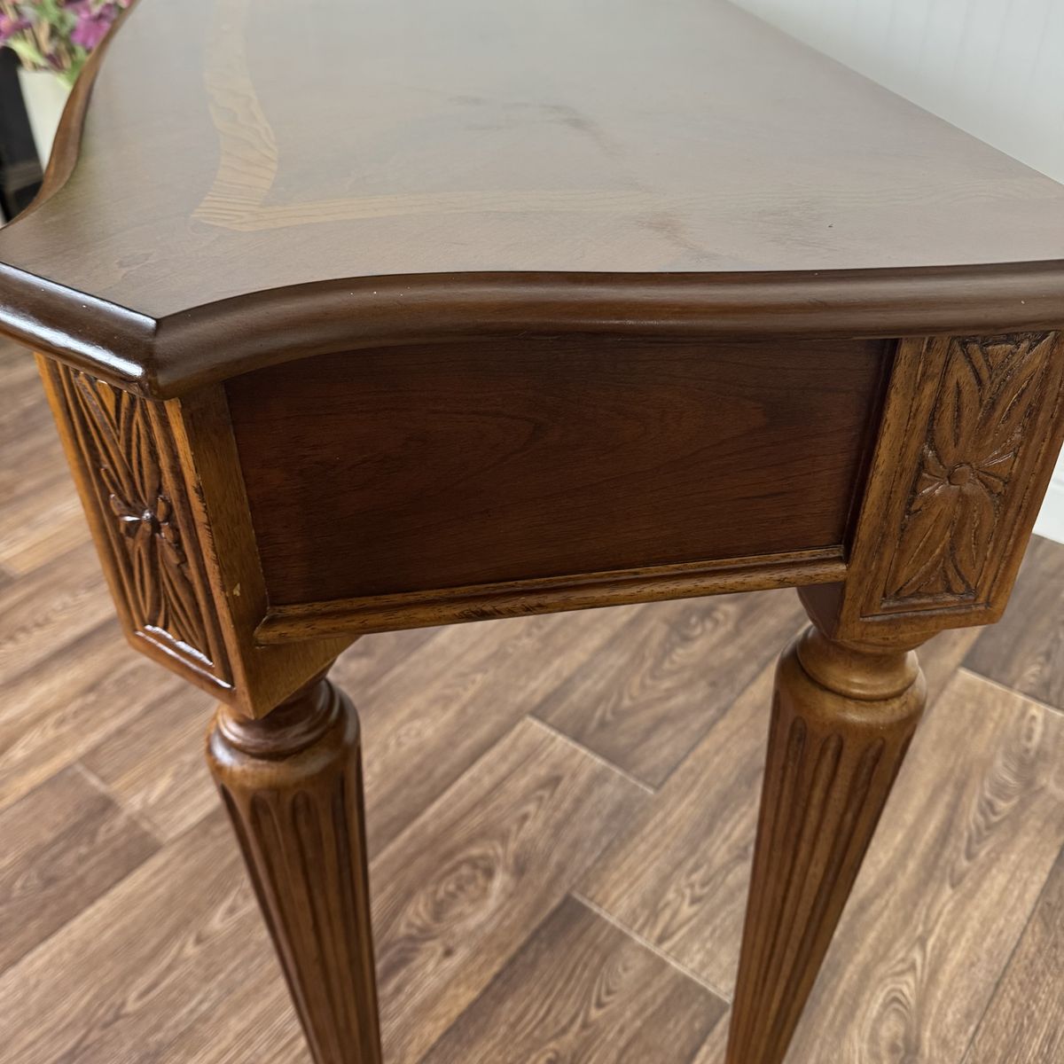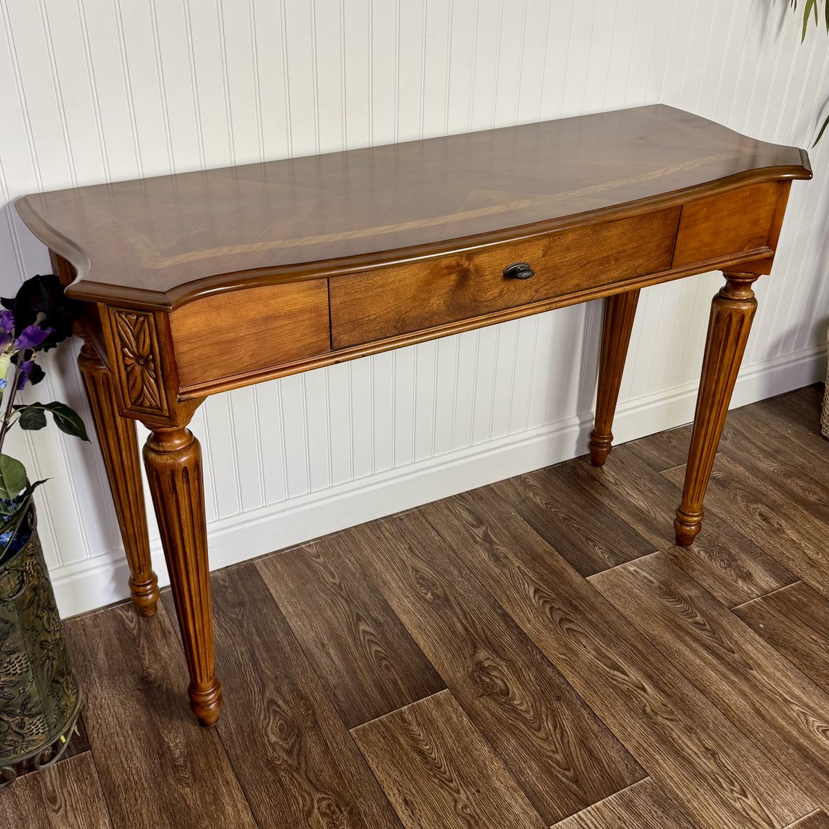 VenmoLovely vintage Federal-style console table featuring a warm mahogany finish, decorative inlay border on the top, fluted legs, carved details, and one smooth-gliding drawer. The slim profile makes it perfect for an entryway, hallway, or behind a sofa.