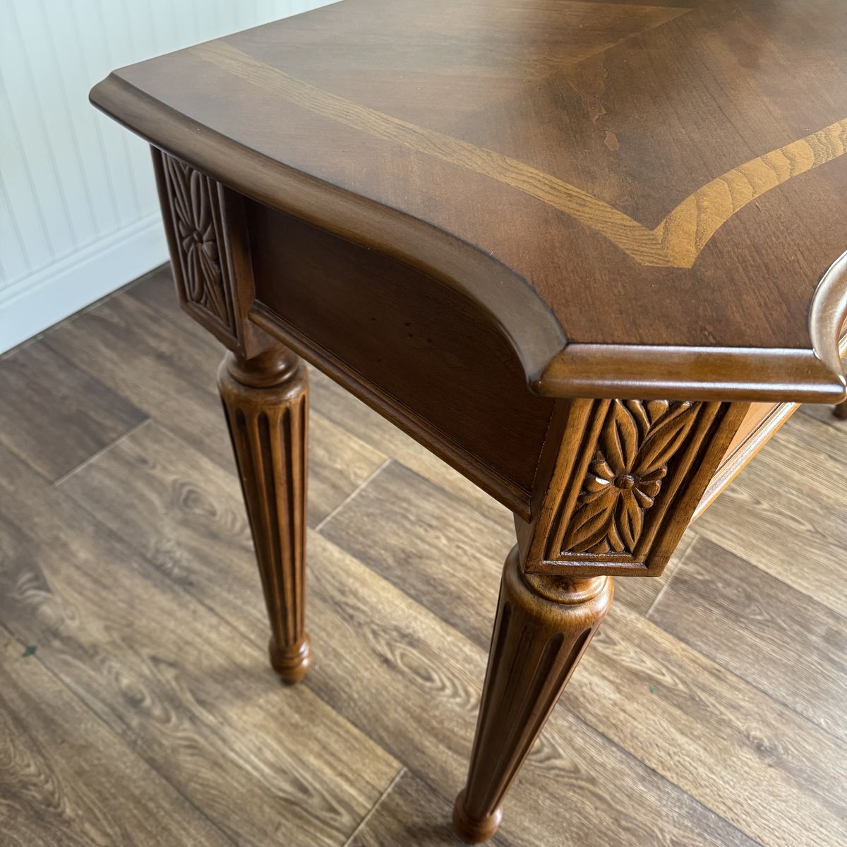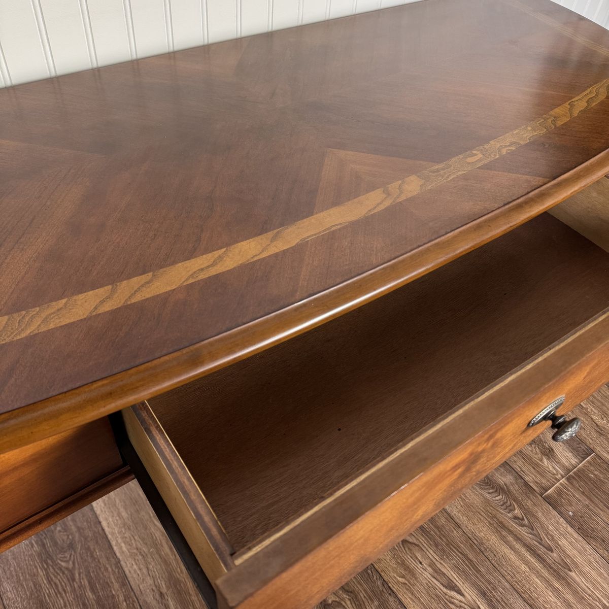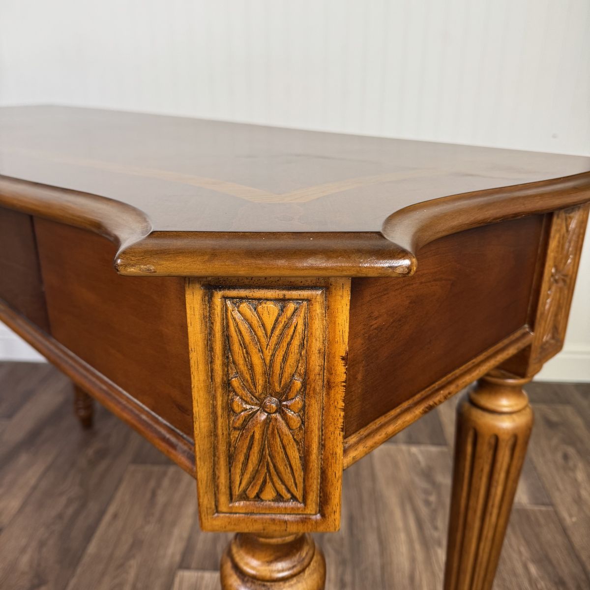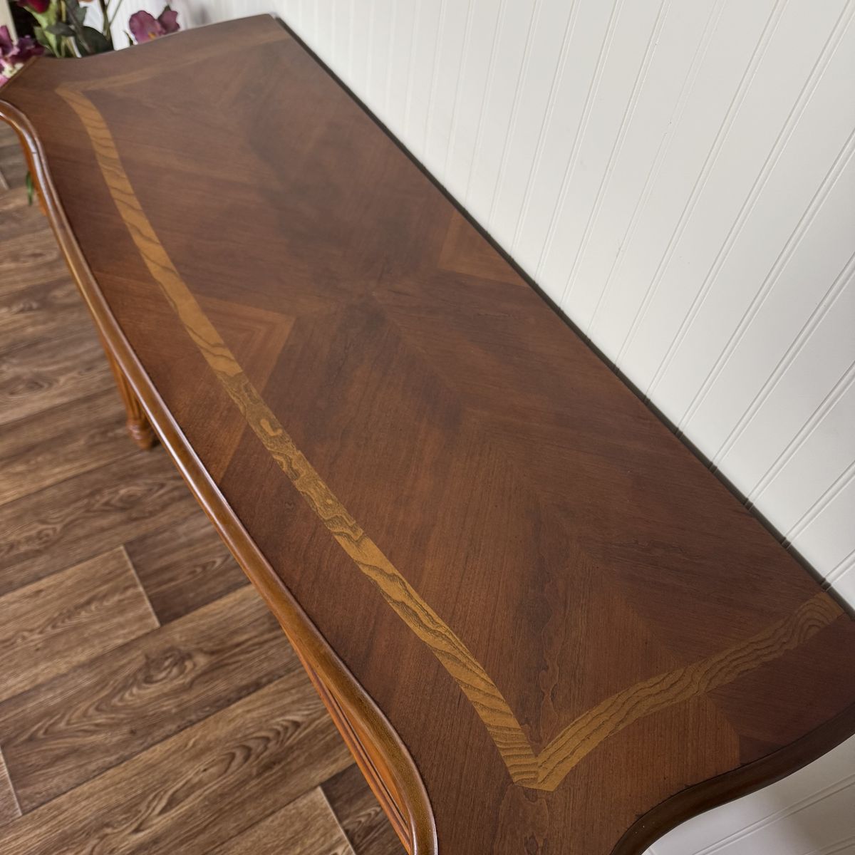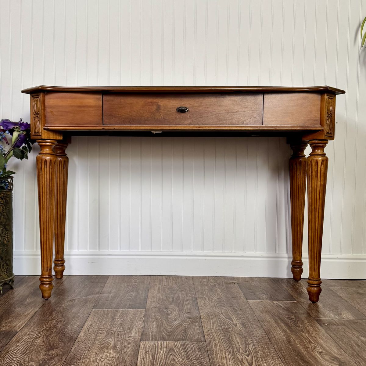 VenmoLovely vintage Federal-style console table featuring a warm mahogany finish, decorative inlay border on the top, fluted legs, carved details, and one smooth-gliding drawer. The slim profile makes it perfect for an entryway, hallway, or behind a sofa.