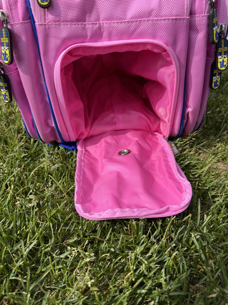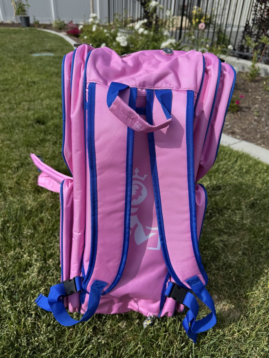 VenmoThese beautiful high-quality heavy nylon polyester. Pickleball and general sports bags are ideal for any activity. Lots of pockets, storage areas and two large along the whole length of the bag that is insulated for warm or cold items. Thick backpack padding on straps, high-quality PVC zipper pulls. Shoe sleeve, padded handles, multiple interior pockets with zippers and webbing for moist items. A perfect getaway bag for overnight trips. This incredibly high-quality sports bag sold for $275. Ltd. supply. Three colors left, Swedish blue and yellow, white with blue trim, and pink with blue trim.
