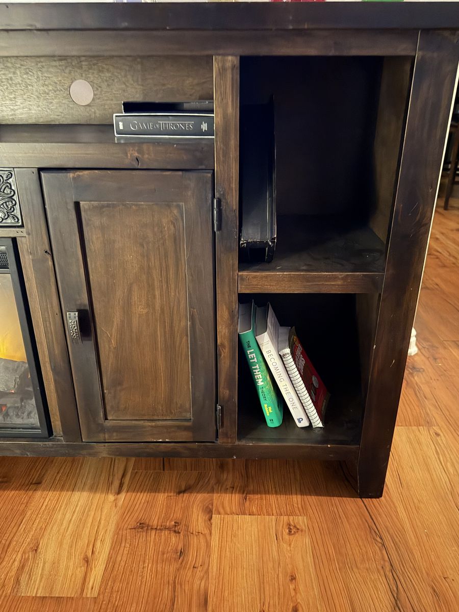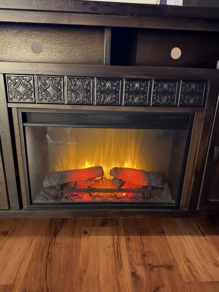 Entertainment Center in very good condition with fireplace that does work and put it off heat flames change colour it is very nice,and very heavy, it’s worth some money. Moving and it won’t re really fit. Will work with you a little on the price if you need too