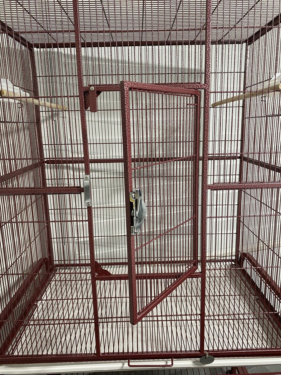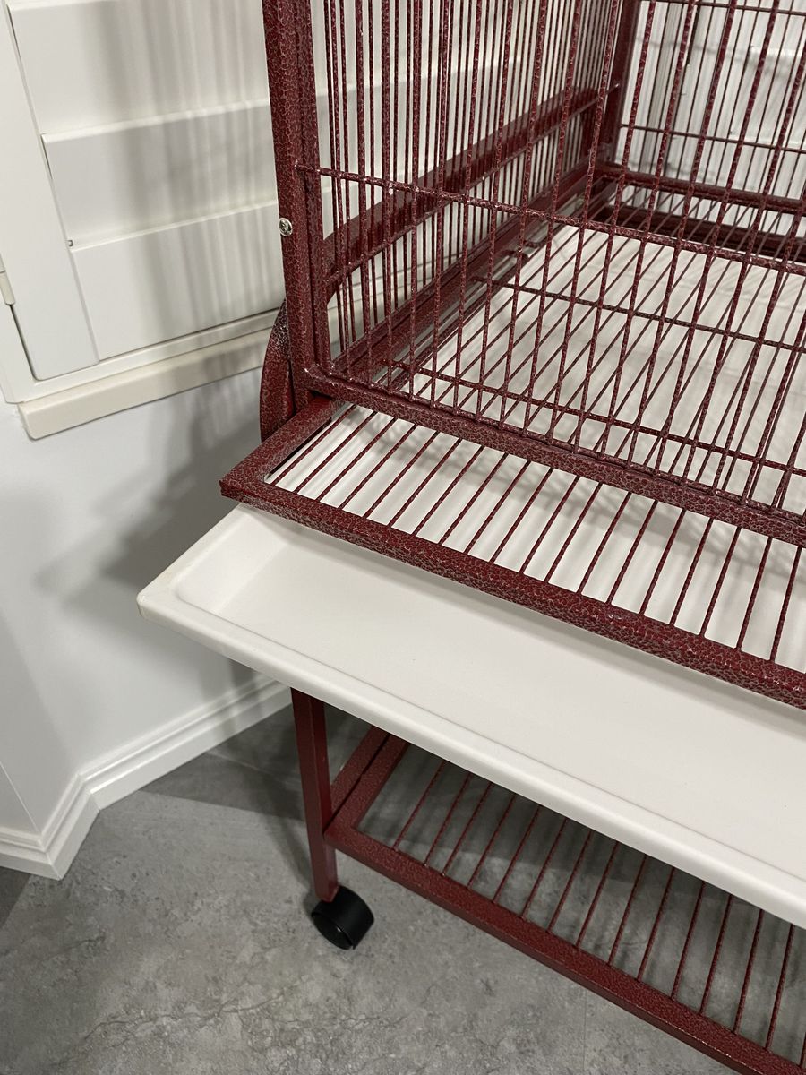 Like-new condition except for a hairline crack in the plastic tray. Currently selling on Chewy.com for $210. Actual living space for the bird is 32” x 21” x 34” high. Total height is 62” but the cage can be separated from the rolling cart. The bottom grill and plastic tray are removable for easy cleaning. Includes 2 perches and 2 feeding dishes. A&E Cage Company calls this color burgundy, but it’s closer to red-burgundy with a distressed/hammered finish.